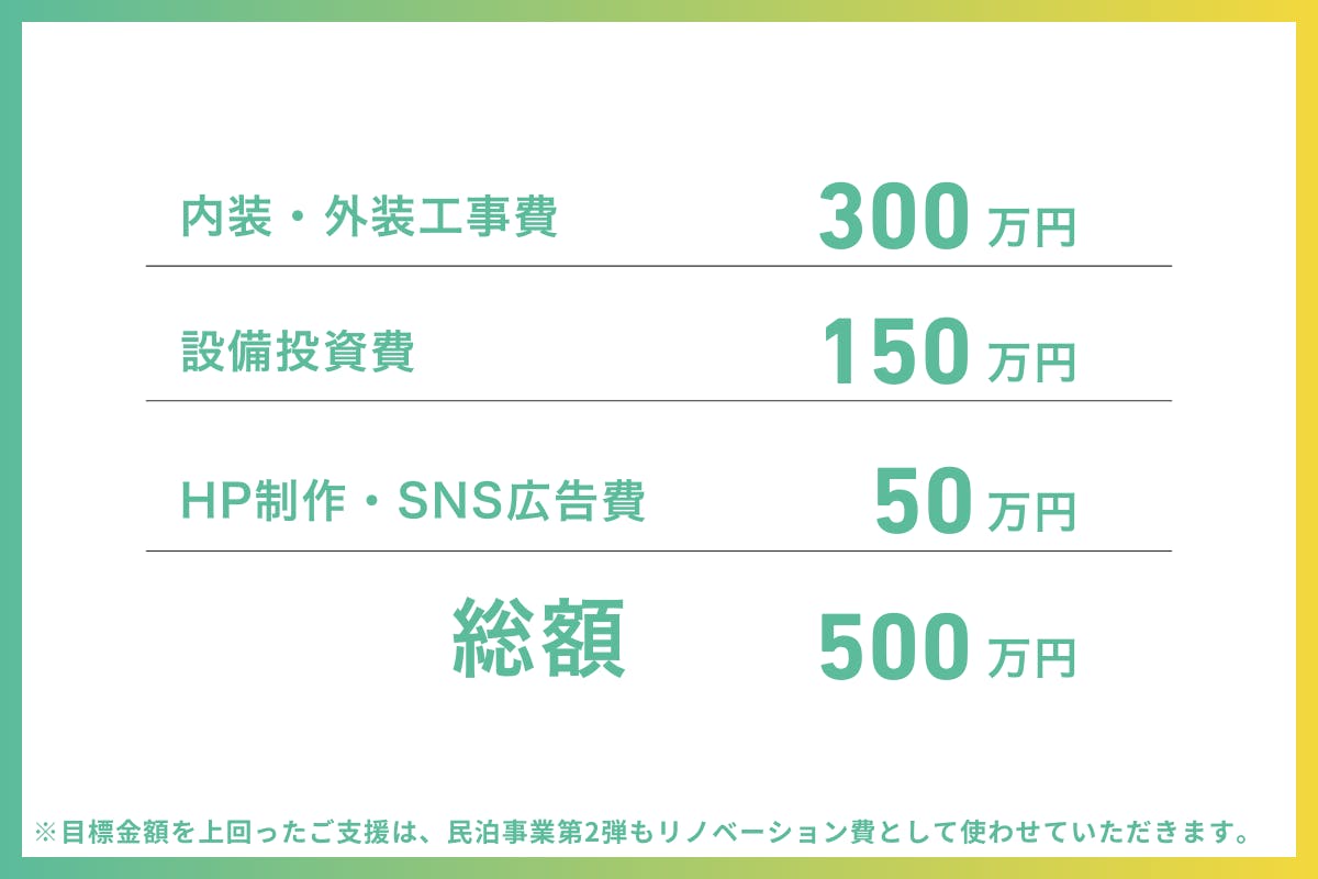 プロジェクトに必要な古民家リノベーション費用に伴う総事業費は500万円です。