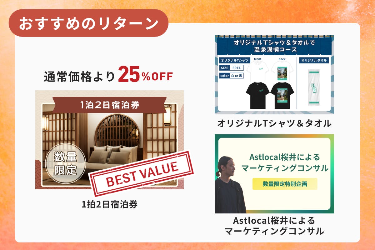 「1泊2日宿泊券」、「オリジナルTシャツとタオル」「Astlocal桜井によるマーケティングコンサル」など、多彩なリターンをご用意しています。