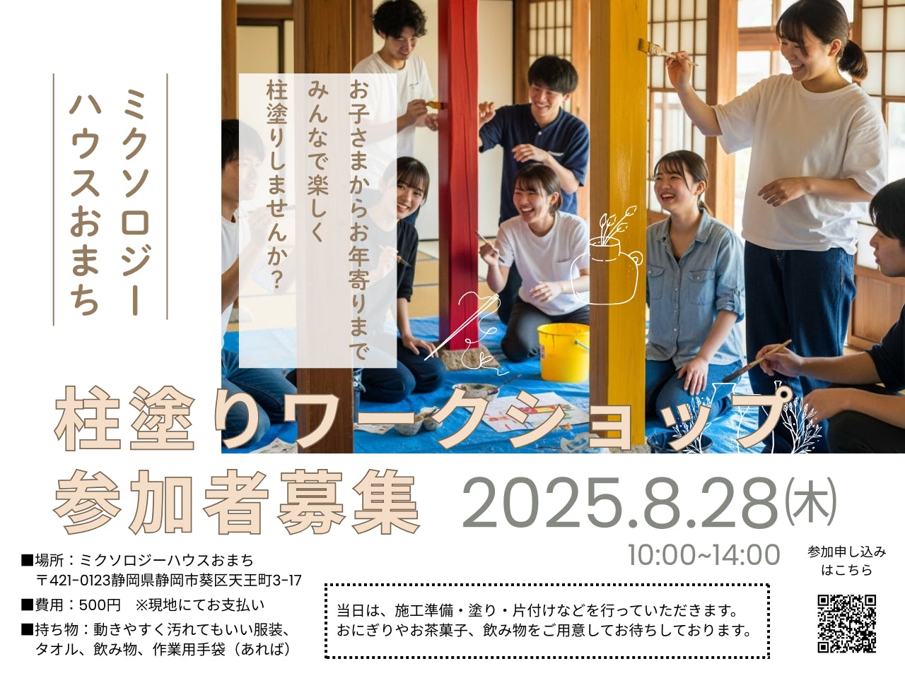 2025/08/19 11:33こんにちは!Astlocalの山本です。ミクソロジーハウスおまち、初のイベント!「柱塗りワークショップ」の開催が決定しました!!_________________________________________▼イベント申し込みはこちらから!!https://x.gd/CRk2Z_________________________________________このイベントでは、昭和の雰囲気が残る元空き家の物件を、ニス塗りをして宿泊施設によみがえらせるというものです。「柱塗りなんかしたことない。。。」「私にできるか心配。。。」こんな方も安心してイベントにお越しください。昨年は用宗のミクソロジーハウスふじやで左官イベントを開催し、合計100名の方に参加いただきました。このときも経験者はほぼゼロ。未経験者だけで壁塗りを行いましたが、皆さん一生懸命がんばっていただけて、最高の出来に仕上がりました。今回も老若男女、経験者・未経験者問わず、大歓迎です!!ちょっと気になるかも。。。という方もお気軽にご連絡くださいね。ご質問などはInstagramのDMよりよろしくお願いいたします。▼柱塗りイメージ_________________________________________▼イベント申し込みはこちらから!!https://x.gd/CRk2Z_________________________________________イベント:柱塗りワークショップ場所:ミクソロジーハウスおまち Mixsology House Omachi 〒421-0123静岡県静岡市葵区天王町3-17https://maps.app.goo.gl/TdRceBEAMhvkBLyv6?g_st=ac費用:500円 ※現地にてお支払い持ち物:動きやすく汚れてもいい服装、タオル、飲み物、作業用手袋(あれば)当日は、施工準備・塗り・片付けなどを行っていただきます。おにぎりやお茶菓子、飲み物をご用意してお待ちしております。※人数が定員を超える場合は先着順になります。Instagramでも最新情報を発信しているので、まだの方はフォローをお願いいたします。■公式Instagramアカウント もっと見る
