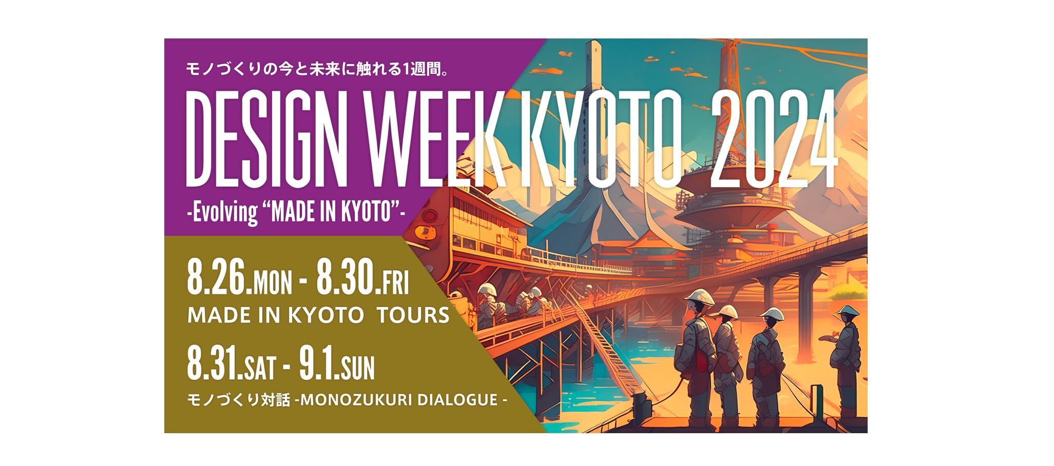 地域とモノづくり現場を訪問し、担い手と交流を深める「MADE IN KYOTOツアー」と、国内外からモノづくりに関連する多様なプレーヤーが集い、これからの「MADE IN KYOTO」を語り合う「モノづくり対話」を通して、モノづくりに興味を持つあらゆる人が互いに学び合い、より豊かなインスピレーション得て、次の時代を切り開いていく創造性を探求するための国際的なコミュニティ・イベントです。