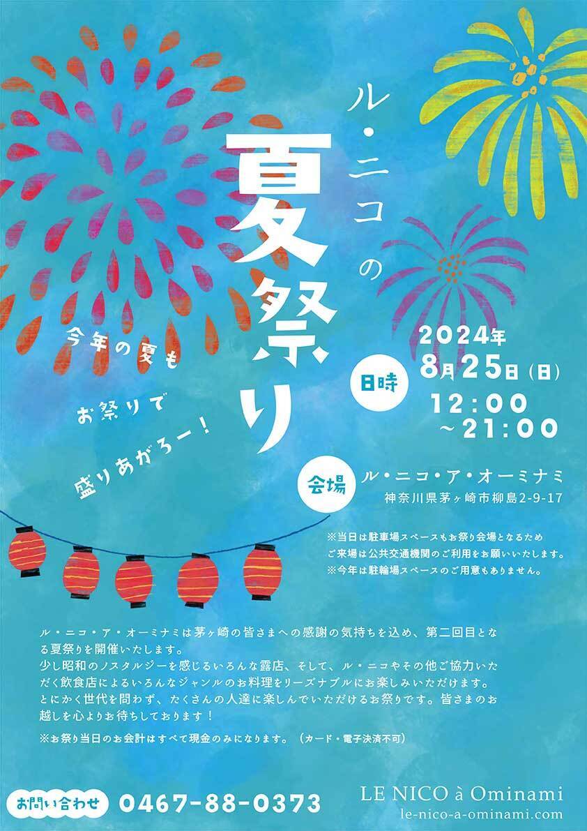 来てくださるお客様への感謝の気持ちを込めて開催した去年の夏祭り。初めての開催でしたが、1日で3000人近くの方が来場してくださいました。飲食店だけではなく、茅ヶ崎で活躍しているさまざまな業種の方にも出店してもらい、世代を超えて楽しめる夏祭りを開催することができました。前回の課題点をもとに、今年はより多くの方に楽しんでいただけるお祭りにしたいと考えています。お子様からご年配の方まで、みんなが楽しくて幸せになれる空間を作って、食べ物は、茅ヶ崎の沢山の飲食店の協力で美味しいものがいっぱい。少し昭和のノスタルジーを感じるような露天の数々。盆踊りやプロのミュージシャンによるライブなどなど、他にもたくさんの仕掛けをご用意しています。