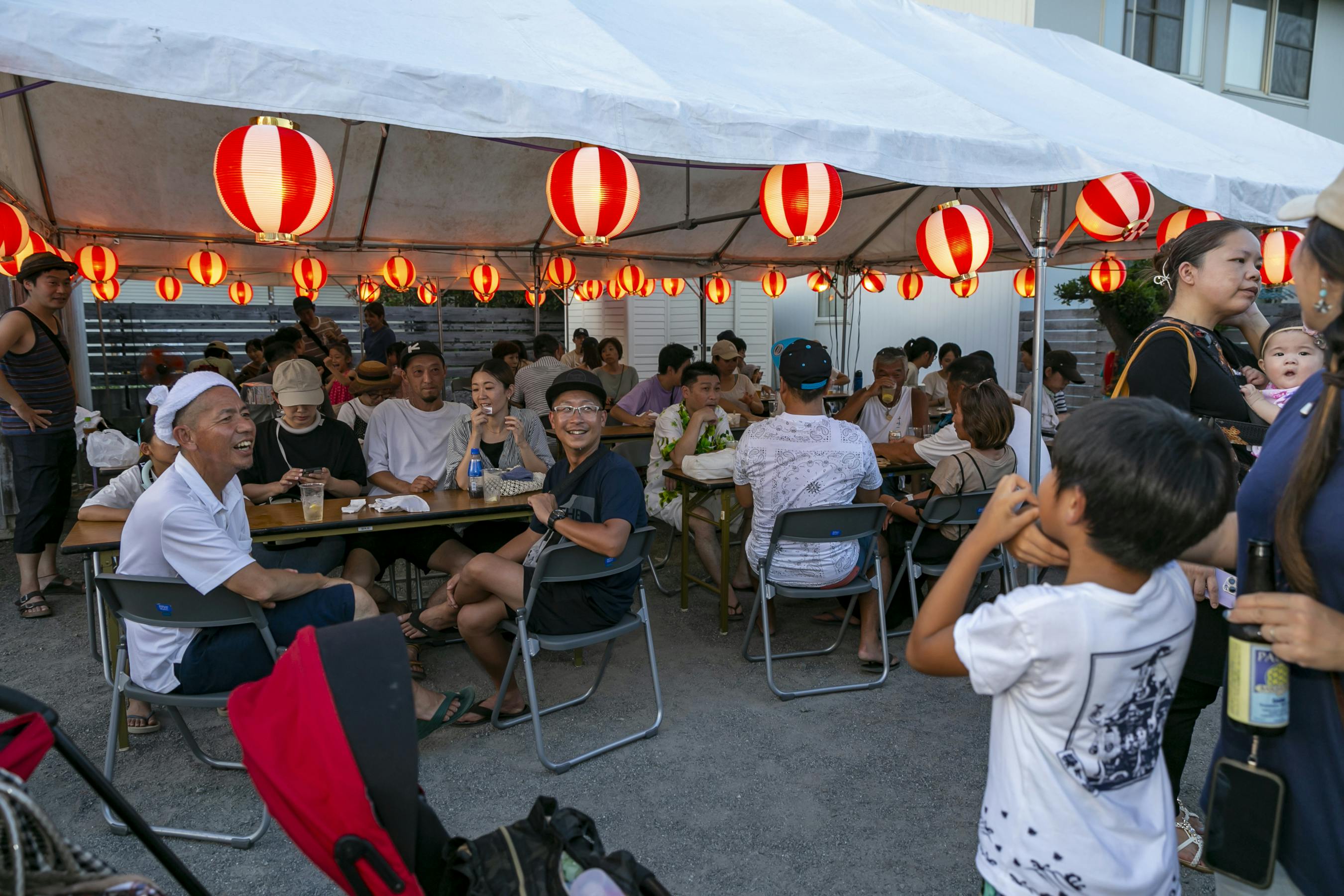 櫓(やぐら)、テーブル、ブーステント、椅子、提灯、音響など。