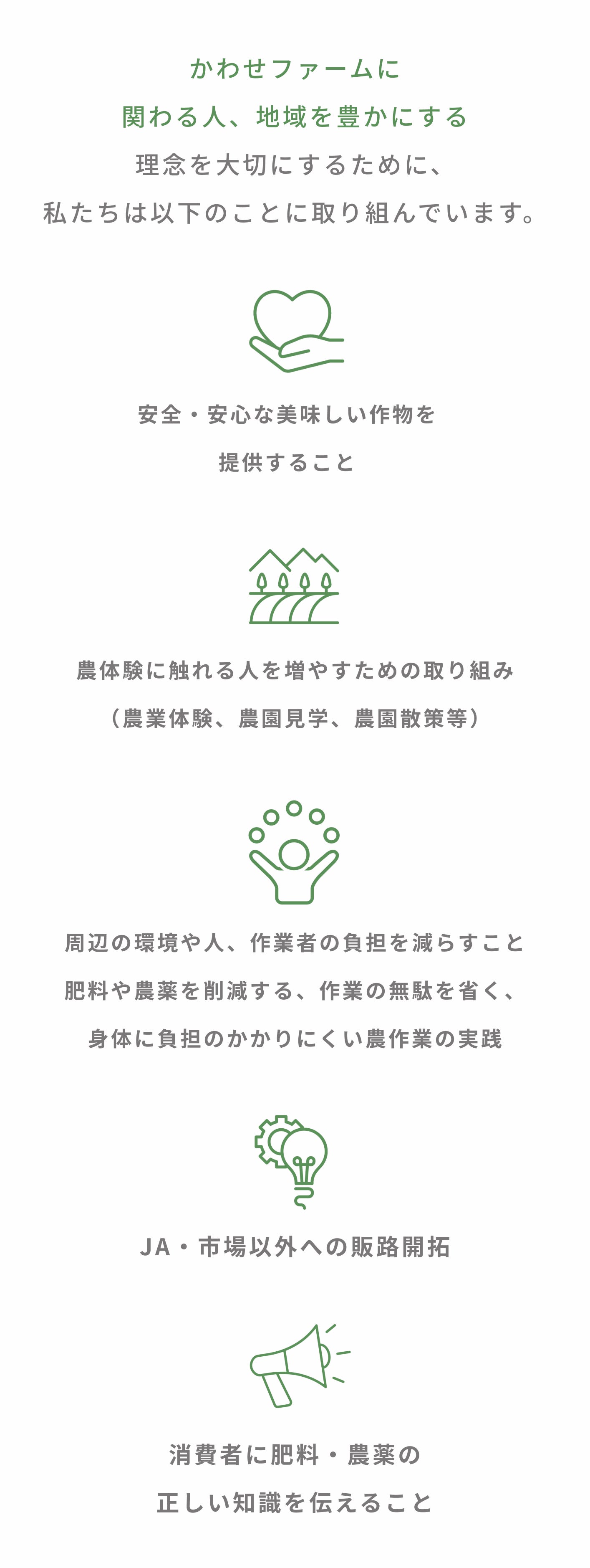 かわせファームでは、環境配慮型の農法だけでもしっかりと経営を成り立たせられるよう取り組んでいます。私たちの取り組みをひとつのきっかけに、環境配慮型の農法で生活が豊かになる農家さんが増えることを目指しています。