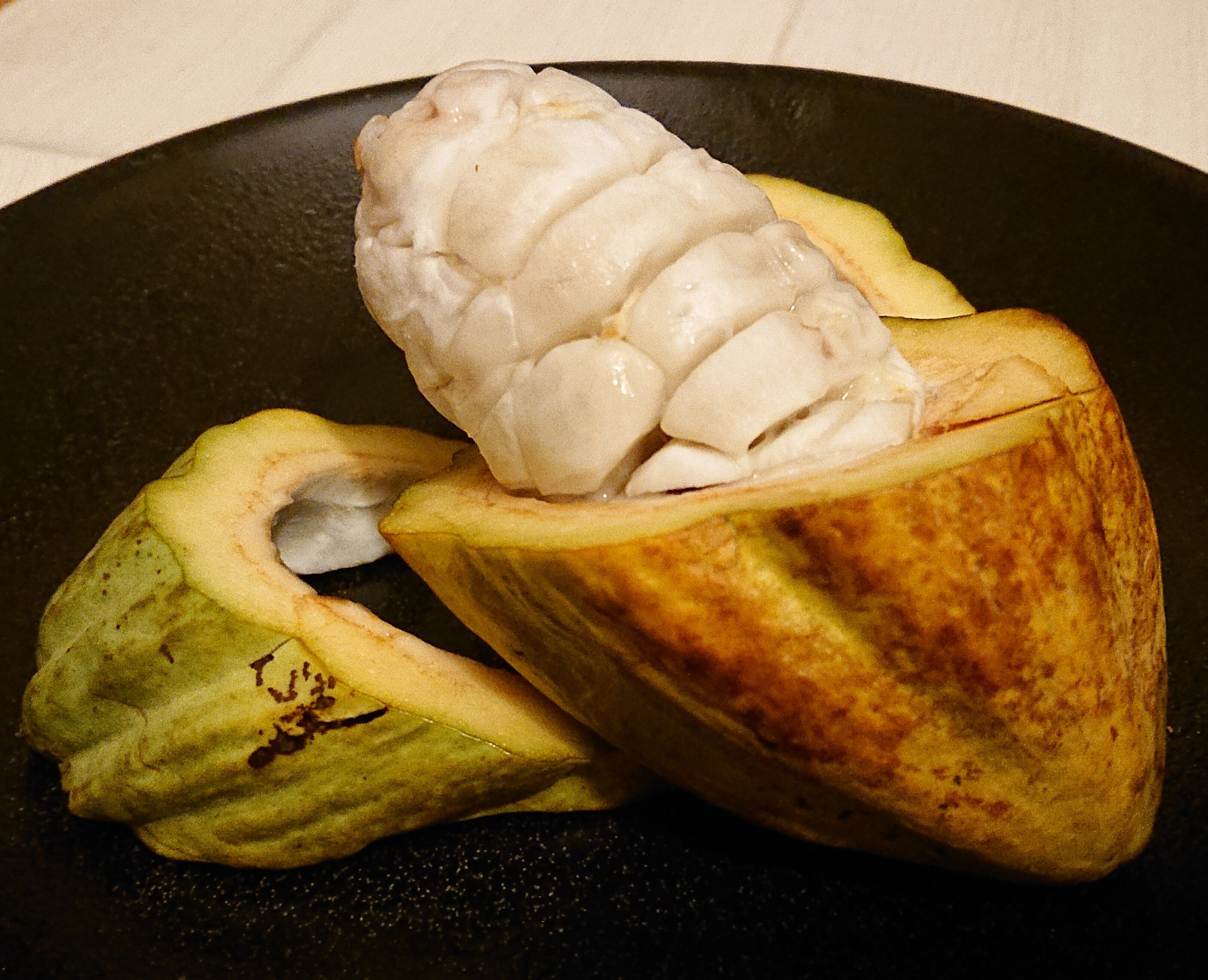 宮崎カカオの大田原です。プロジェクト開始から1週間経過しました。早速34名の方々から応援いただき、おかげさまで目標の半分まで迫ってきました!皆様の応援コメントも全て拝見しており、大変励みになります。ありがとうございます。引き続き目標達成に向けて頑張ります。カカオと言えば、チョコレートの原材料である「カカオ豆」が有名ですよね。今回から、意外と知られていないカカオのことについて、試験栽培していたころから含めて4年間カカオを調べ・触れ続けてきた男がコラム的な感じで定期投稿していきたいと思います。第一回は、「カカオって、実はトロピカルフルーツだった!」ということで、フルーツとしてのカカオについて紹介します。宮崎はマンゴーやライチ、パパイヤといったトロピカルフルーツの生産が盛んで、特にマンゴーは「宮崎のイメージは?」と県外の方に尋ねると「マンゴー!」という回答が半分以上占めるくらい宮崎の顔と言えるような存在となっています。トロピカルフルーツというと、南国にいる気分になる「とろけるような芳醇な香り」が特徴的で、糖度も高く、美味しいものが多いですよね。実は、、、これらマンゴーと同様にカカオもトロピカルフルーツなんです!カカオと聞くと「カカオ豆」を連想することが多く、「豆」という言葉から大豆やさやえんどうといった部類の植物をイメージされることも多々あるのですが、いわば野菜のような存在ではなく、下の写真を見てわかるように、植物としてのカカオは桃や柿のような「果樹」であり、熱帯原産であることから、トロピカルフルーツの一種となります。幹や枝に実る黄色いものが果実(フルーツ)、白いのは花や蕾です。この写真の黄色い果実を割ると、トップ画像のような状態となります。白い部分がライチの可食部のような果肉。その中にカカオ豆となる種子が入っています。果肉厚めの品種をカットしました。リターンのカカオ果実は同じ品種のものをお送りする予定です。では、果肉はどんな味をしているかというと、、、「ライチやパイン、バナナ」などの様々なトロピカルフルーツを掛け合わせたような風味と甘酸っぱさが特徴と言えます。品種によって風味や糖度が異なりますし、以前、加工試験用に冷蔵庫で熟成させたことがあったのですが、極限まで熟成させると、酸味が抜けてメロンのような甘さとなったのは衝撃的でした!果肉はジュースにして飲むのが一番オススメで、「爽やかなレモネード+トロピカル感」が味わえるのが特徴的!さっぱり飲めるので、暑い夏に飲むと最高です!!逆に冬に飲みたくなるカカオ豆を原料とした濃厚なチョコレートドリンクは様々な製品がありますが、カカオ豆と果肉、元は隣同士くっついていた存在とは思えないほどの対照的な味わいの違いに驚くと思います(宮崎カカオのチョコレートドリンクとカカオジュースを両方飲めるイベントも将来やってみたいなあ、、、)。ということで、トロピカルフルーツとしてのカカオの紹介でした。カカオ果実丸ごと一個や、果肉を食べられる「プレミアム農園見学会」も御用意しています。※プレミアム農園見学会については、ご用意している1oセット分(残り6セット)だけで、完売後の再追加は考えておりません。