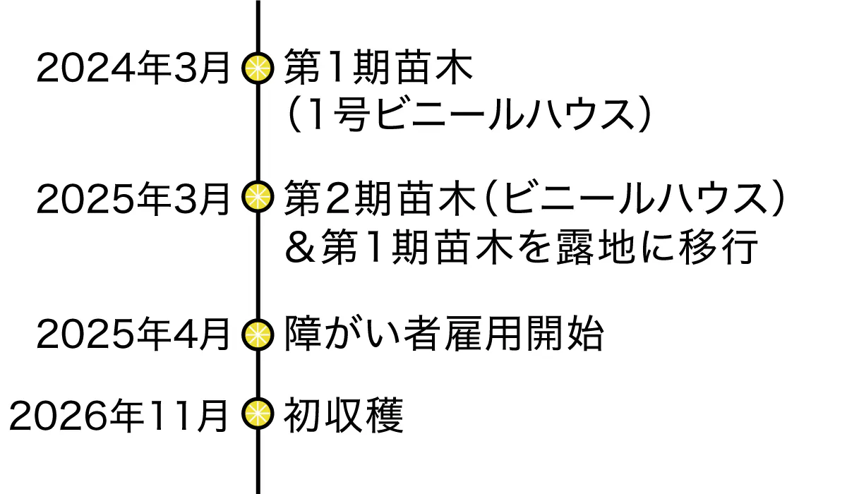 A:レモンの収穫には最短で2〜3年必要となるため、2026年11月の初収穫を目標としております。