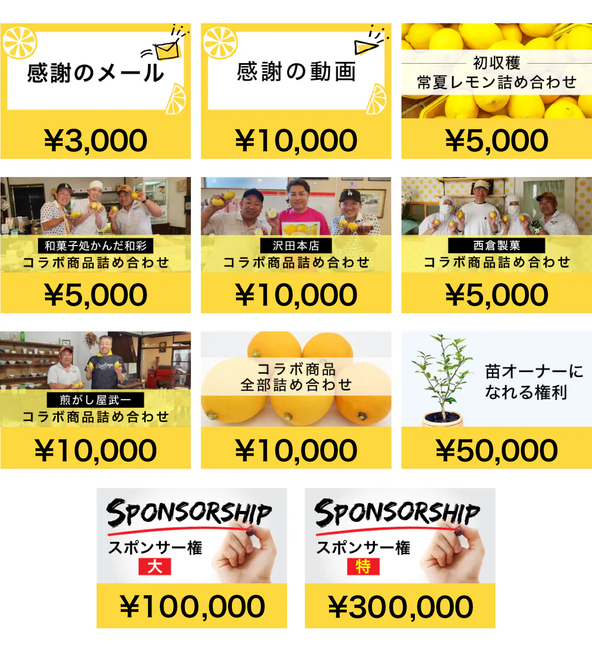 しかしながら、地元事業者と試作開発中のレモン商品をはじめとして、現在植樹中の苗木のオーナー権などをご用意致しました!