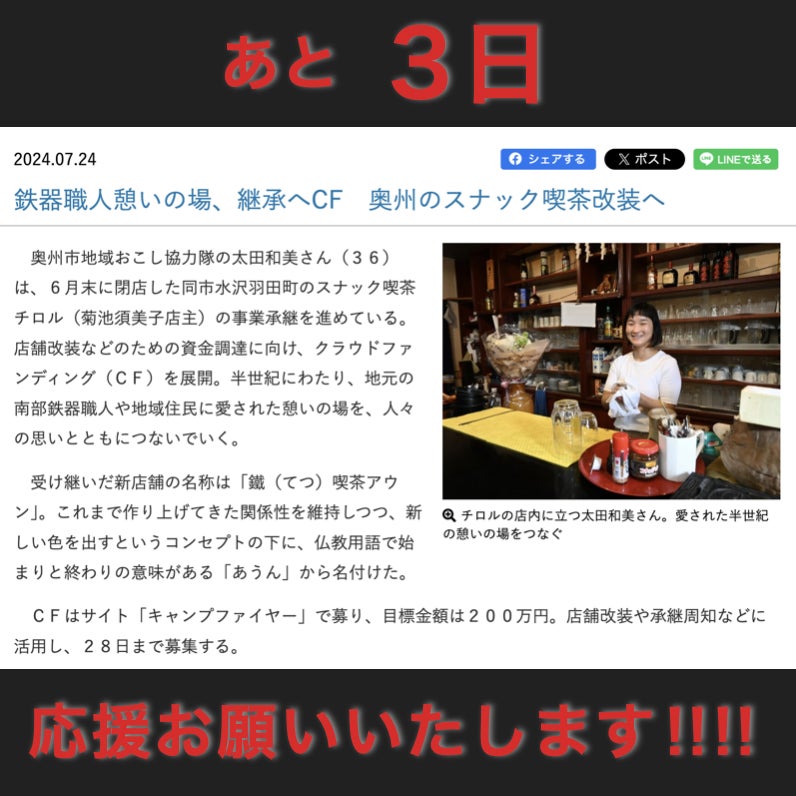 2024/07/26 08:00【鉄瓶婆_クラファン大台‼︎‼︎‼︎】最後の追い風!! 一面で紙面紹介と大きな記事!!! 岩手日報さん、ありがとうございますそして昨夜、\\ クラファン70%到達!//あと3日と迫り、70%まで来ました!140万9,833円‼︎ 総支援者数166人!感謝してもしきれません。ギリギリまで迫っても支援が増えてくれています。本当に、ありがとうございます!心より感謝申し上げます。残された3日間、全身全霊で臨みますので、最後の最後まで応援よろしくお願いいたします!▶︎南部鉄器紹介クラファンページ本文で紹介させていただいた南部鉄器「気づかい」こちらは、工房和秋の金野和秋さんの作品です。平泉にある工房で、木製の部分も和秋さんの手づくりです。鉄器職人は型づくりなどで木工の技術も必要とされたため、本当に器用な方が多いです。▶︎南部鉄器の課題水沢では深刻な後継者不足と受入態勢の整備不足が大きな課題となっております。今回取り組んでいるスナック喫茶の事業承継はもちろんですが、クラファンページの本文にあるように、私には地域おこし協力隊のミッションがあります。【PR活動】・南部鉄器をより身近なものにすることを目的とした活動(カフェ開業/鉄瓶婆/伝統産業会館リニューアル)【後継者育成事業】・美大やものづくり系の大学と連携し、学生インターンを定着させられる仕組みづくり・他地域の伝統工芸士育成事業の視察▶︎クラファンに挑戦した理由カフェの改修費を応援していただくことはもちろんですが、何よりも先に述べた、水沢南部鉄器の課題を多角的な視点から知っていただきたいと思ったからです。「伝統工芸はどこも後継者がいなくて大変そう」ではなく、「鉄瓶婆のクラファンを応援してくれた職人さん、後継者いなくて困ってるんだって」と、クラファンページをご覧いただいた皆様が自分ごととして、話題に挙げていただけたら嬉しいです。(同協力隊の相田さんと挨拶回りしたとき写真お借りしました) もっと見る