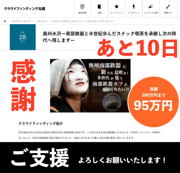 【クラウドファンディング名鑑に掲載!】日本名鑑(株)さんが運営している、クラファン情報を集約したサイトにプロジェクトを掲載していただきました!https://crowdfunding.meikan.org/project/campfire-767800/ありがとうございます!!