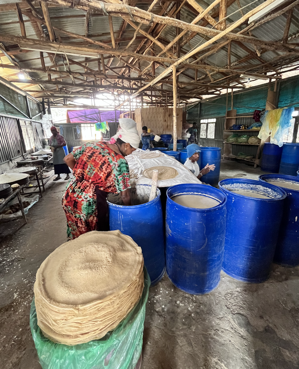 (上の写真は、エチオピアでは有名な食べ物、インジェラ(小麦と水を混ぜ、発行させて焼いた物)を作っている様子です。)