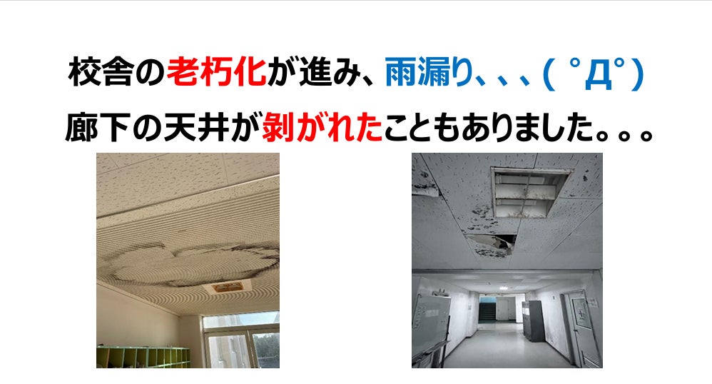 これまで、校内での設備点検や修繕を行ってきましたが、予算の関係で大規模な改修は難しい状況でした。本当に何とかしたいと考え、クラウドファンディングを通じて皆様のご支援をお願いすることに決めました。
