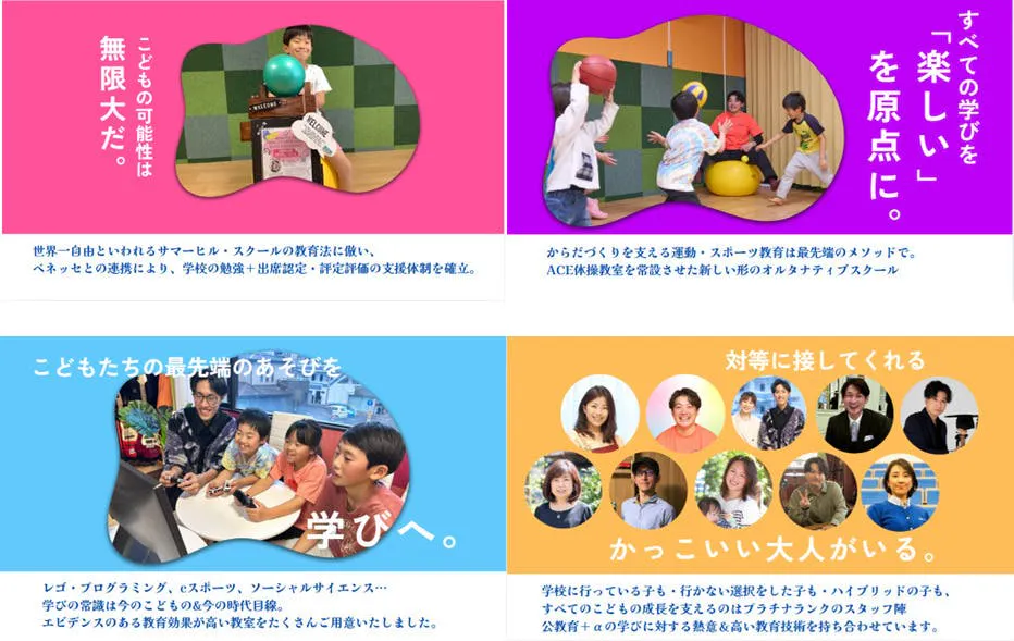 これまでのフリースクールの多くが、発達に悩みのあるお子さんを対象としていますが、本校では不得意がある子だけではなく“得意もとりこぼさない”教育、それに加え、不登校の子も学校に通っている子も利用ができるフリースクールを実現し、インクルーシブな教育、多様な学びの場の重要性を発信するとともに、本校の子ども達の才能を世界で活躍できるよう育てたいと考えております。