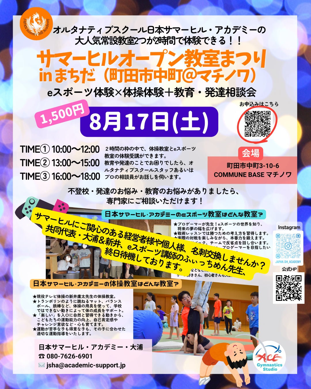 ご支援者様みなさまへのご案内です。8月17日(土)、会場は町田中町の”マチノワ”。こちらを貸し切ってのイベントを開催する予定ですが、この日、本校へご関心のある経営者様や個人様に自由にご来場いただき、名刺交換をさせていただける日とすることに決めました。日本サマーヒル・アカデミーは、今後より発展的に事業を拡大したい思いがあり、より多くの事業者様・経営者様とお話しできればと考えております。教育におよそ関わりがない方でも、子どもたちの将来の選択肢の1つになればと思いますので、さまざまなお立場の方にオルタナティブスクールへの関心を持っていただければと思っております。本プロジェクトにご支援くださった皆様、ご都合がつく方がいらっしゃるようでしたらぜひ足をお運びくださいませ。
