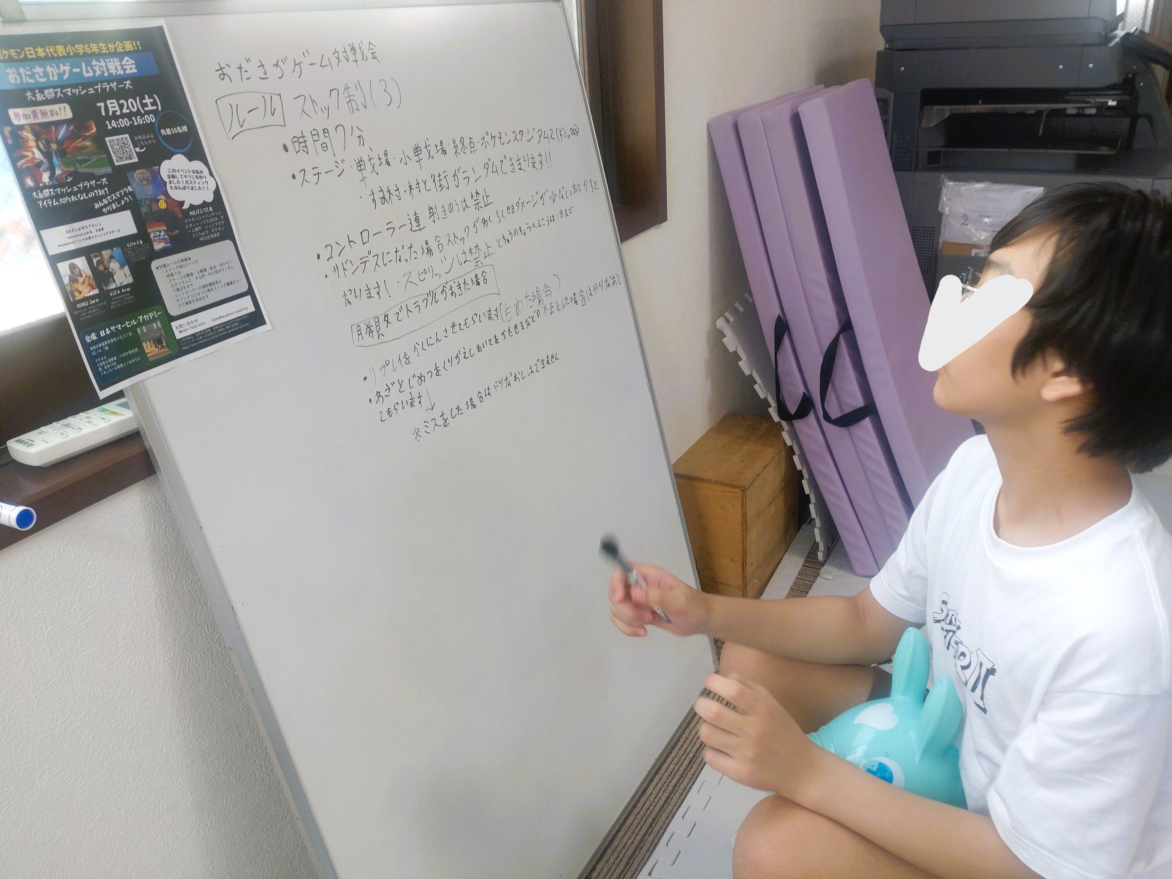 本校小学6年生、スマブラ大会を企画しました。先日チラシデザインを完成させて印刷、ポスティングまでしっかりやりきりました。大人は、参考にできる過去のチラシをお渡し、デザインソフトの操作方法と必要な情報をお教えし、少しだけフォントをさわっただけ。ぜひたくさんの方に足を運んでいただきたいなと思っております。彼は本校eスポーツ教室への参加をきっかけに通うようになり、ポケモンに熱中!ポケモンジャパンチャンピオンシップス2024のジュニア部門で日本代表となりました。8月に開催される世界大会、みんなで応援しております!!さて本日は、当日来てくれた方に説明するためのルールを記載したボード、こちらを手書きで作成しました。漢字が苦手でしたが、丁寧に書き込みました。また、近くのコミュニティセンターへチラシを置いていただくお願いに歩きました。その後はいつも通り。体験の小2さんもいらっしゃいまして、ゆったり&心地よいにぎやかさの中でクローズ17時を迎えました。日本サマーヒル・アカデミーでは、子どもたちのやりたいを全力で応援し、カタチになったものはお遊びで終わらせず、その後のスキルとなるよう、人生で積むキャリアの1つの実績となるよう、社会に出すところまでサポートします。