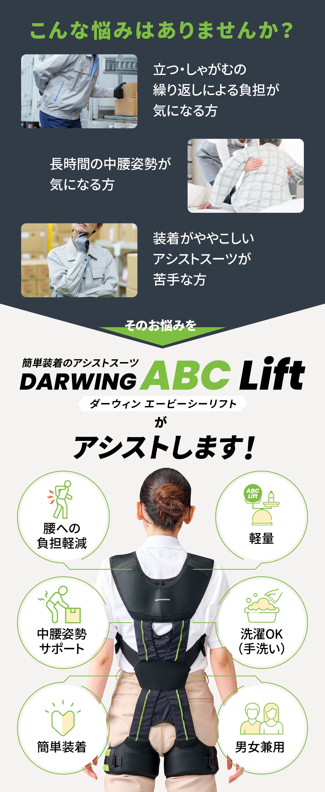 「夏場では暑い」「もう少し動きやすくしてほしい」など、ご使用いただく方が増えるにつれお客さまから多くのお声をいただくことも増えました。そこで、だれでも簡単に装着できて、その場ですぐにアシスト力を実感できる「簡単装着」「アシスト力の強い」「お手頃価格」の【DARWING ABC Lift(ダーウィン エービーシーリフト)】を開発しました。