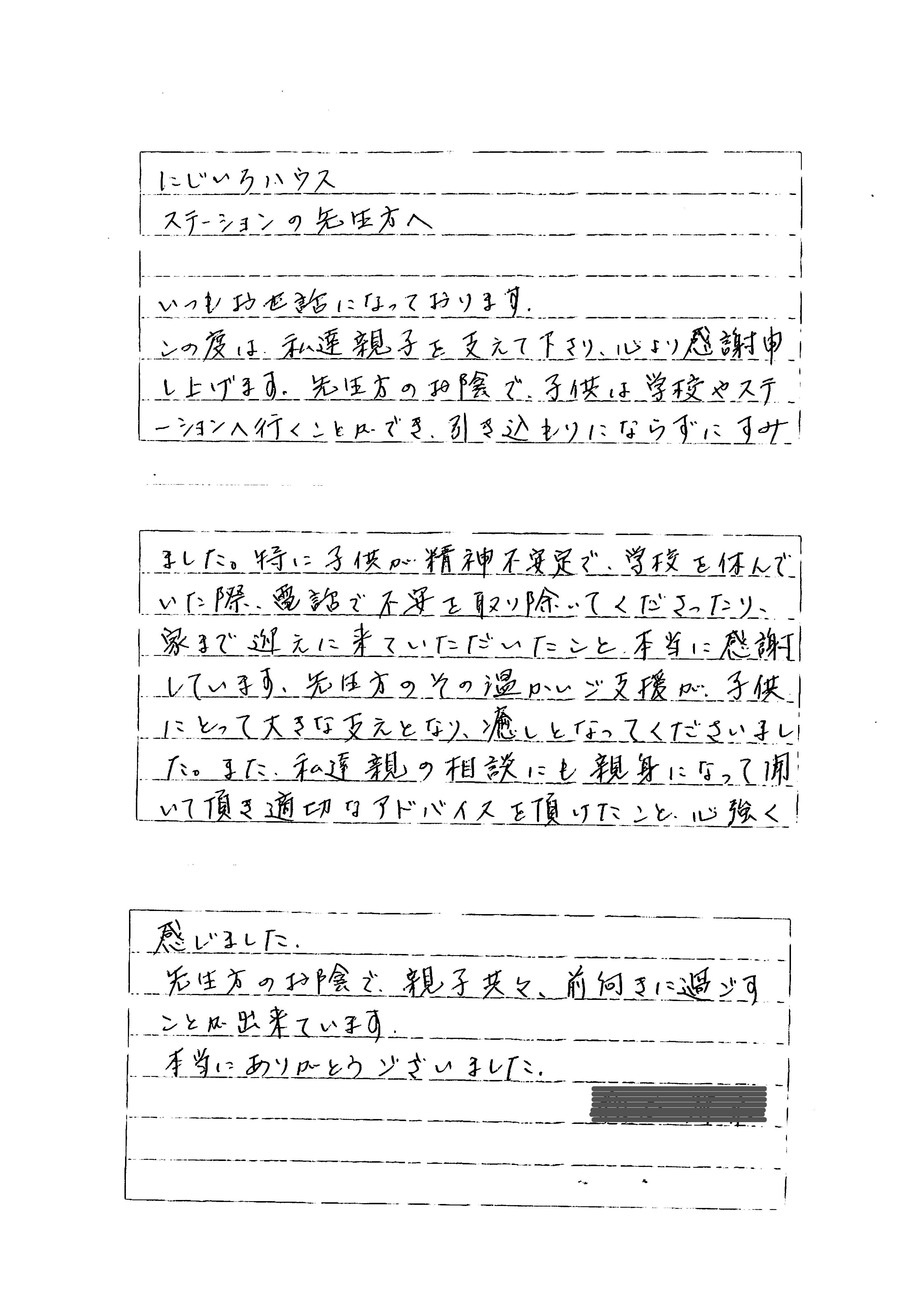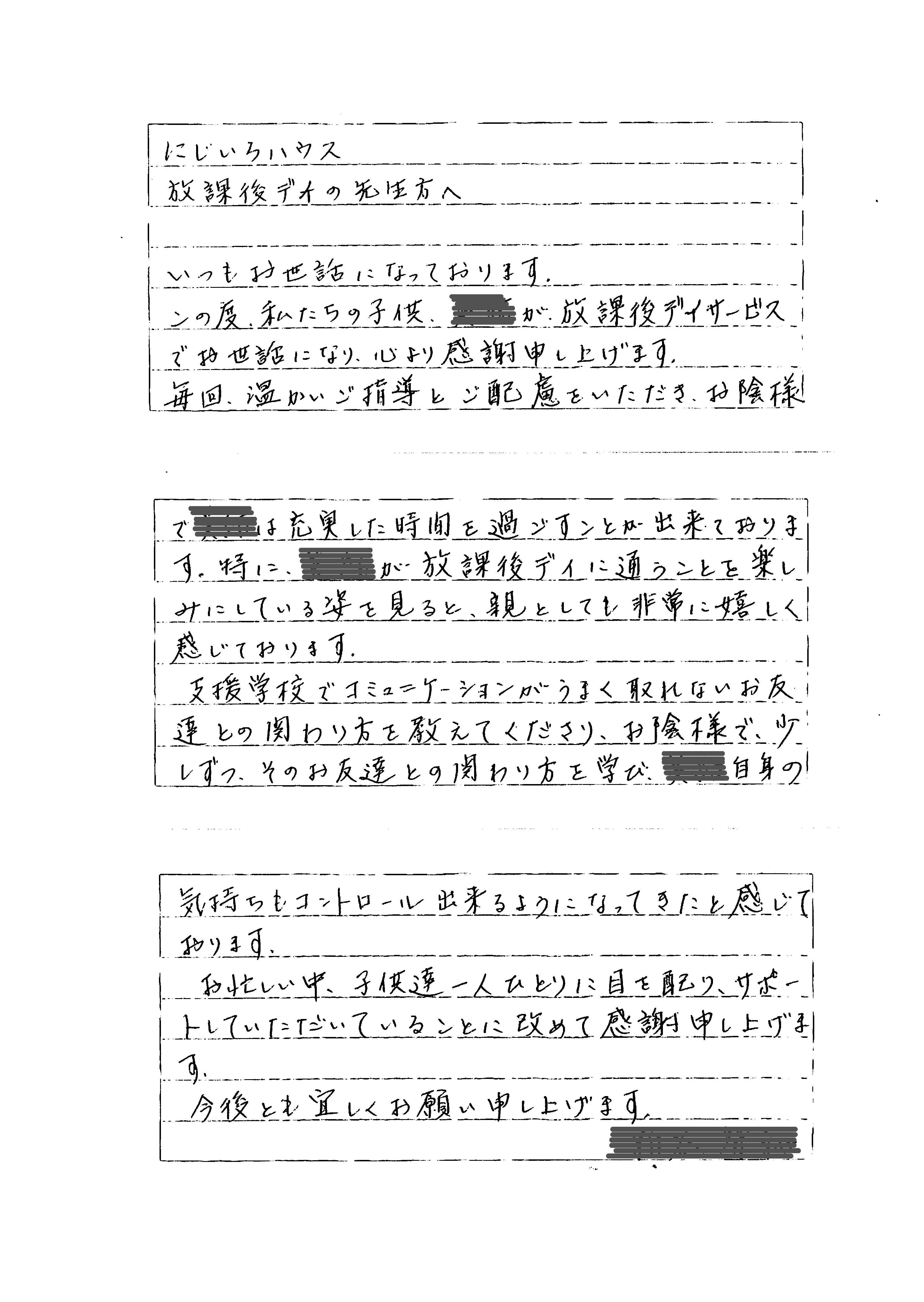 これまで学校以外に子供達の居場所が無く、安心して子供を預かって貰える施設も無く、 鴨川市で育児する大変さに日々疲弊していました。ですが、にじいろはうすに通い始めてから子供達の表情が明るくなり、精神が安定し家庭で も穏やかに過ごす時間が増え、私にも心に余裕が生まれました。 代表理事の加藤惠子先生を始め職員の先生方には感謝の気持ちで一杯です。