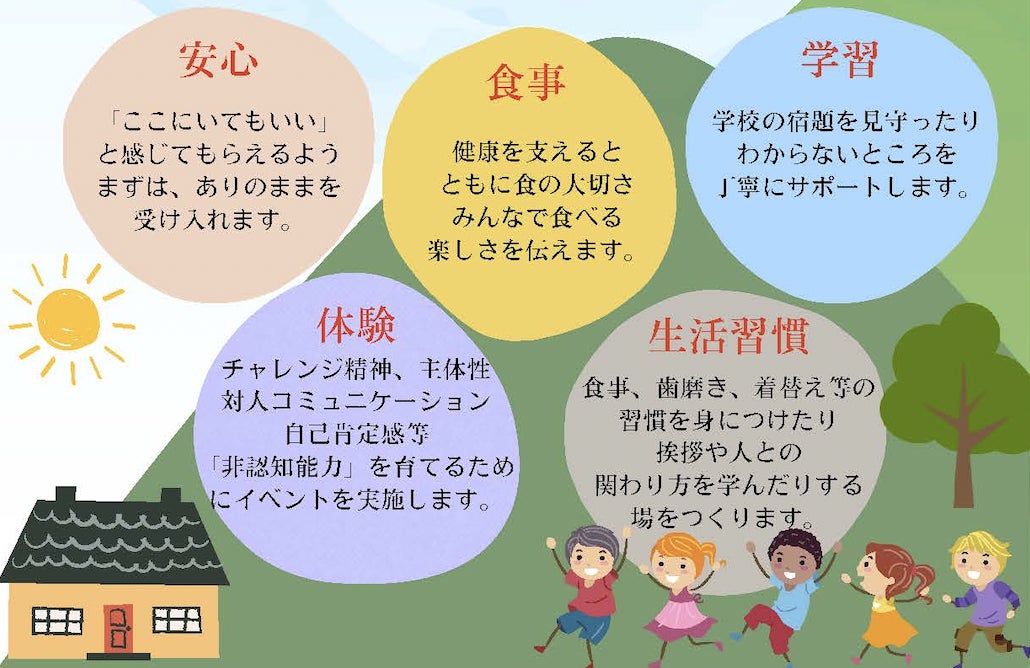そこで、子どもたちが孤立しやすい放課後の時間、家庭や学校以外の場である「子ども第三の居場所」を提供することで、信頼できる大人や友達と安心して関わりながら、将来の自立に向けた「生き抜く力」を育みます。