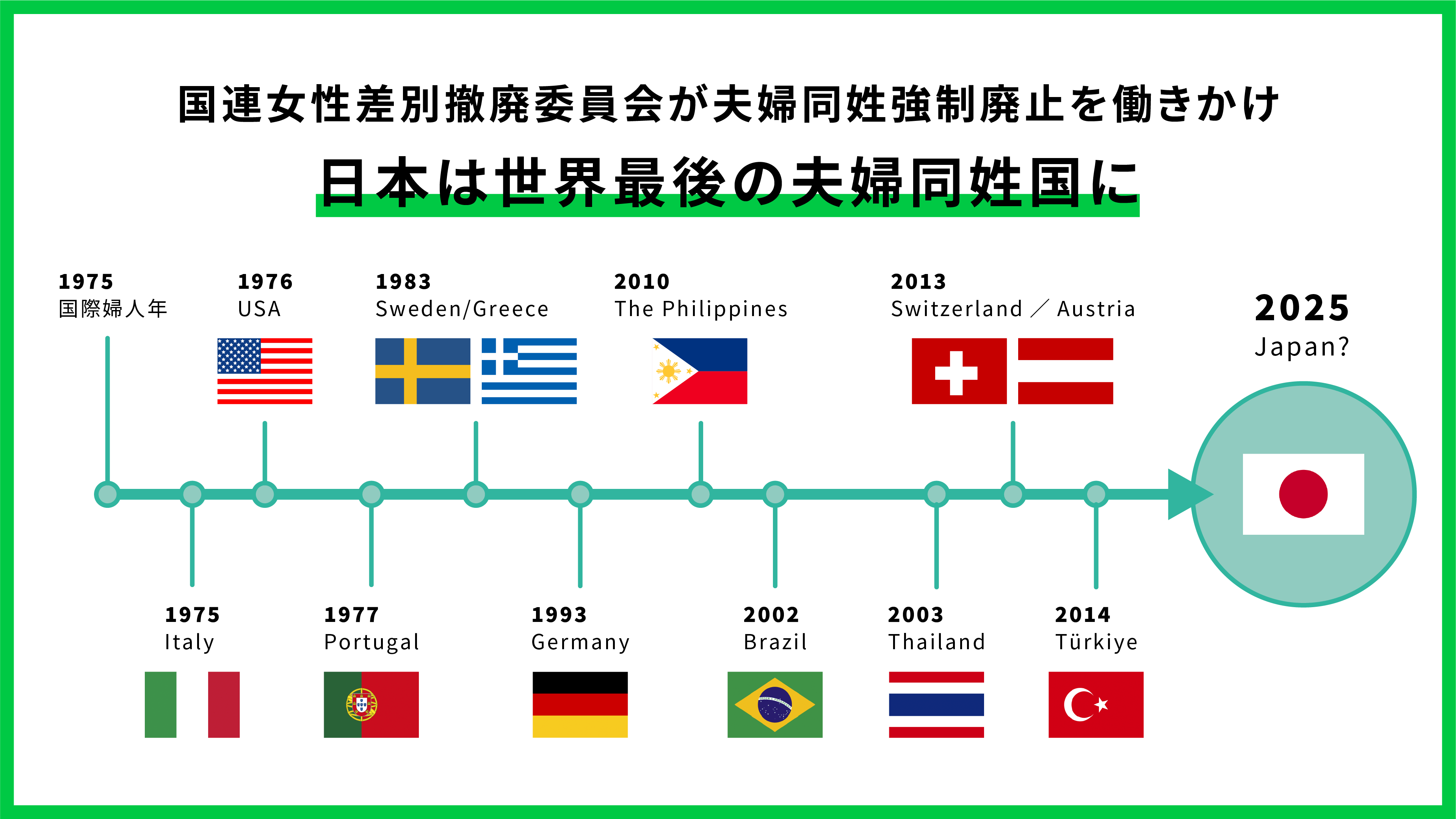 それに応じて夫婦同姓だった国は次々と、お互い改姓しない夫婦別姓も選べる選択制を導入。残すは日本だけとなりました。