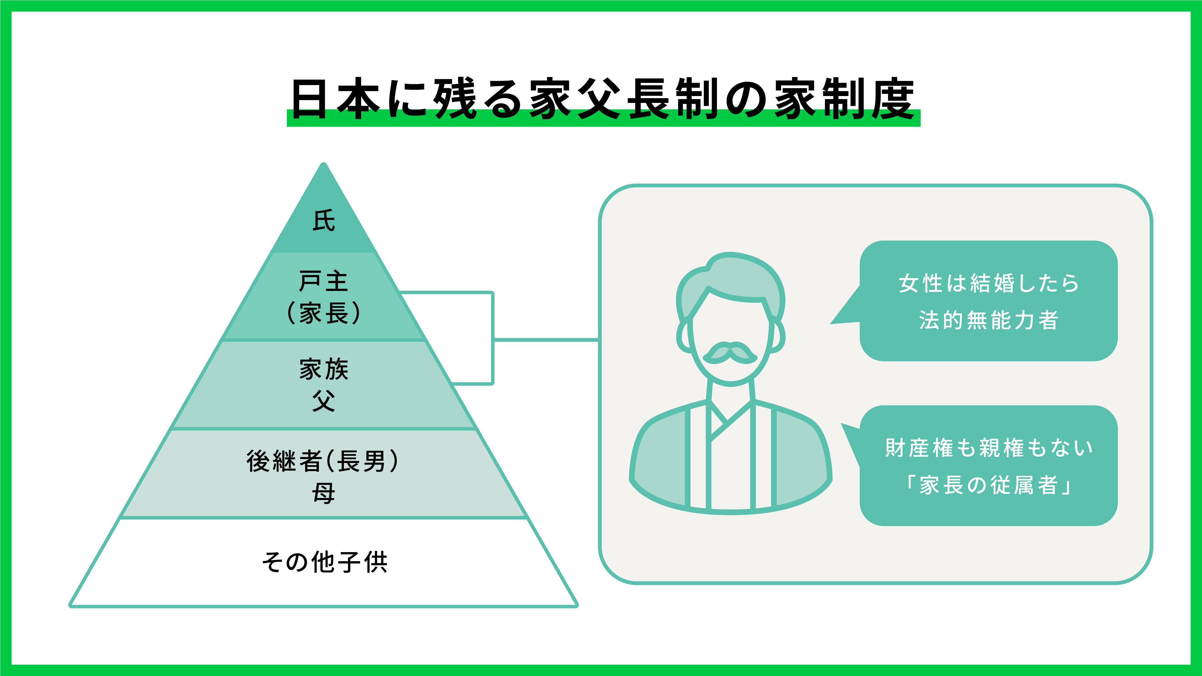 夫婦同姓と同時に日本政府が導入したのが、「家制度」という差別法。NHKの朝ドラ「虎に翼」で描かれているように、家制度によって女性は法的に無能力者となりました。財産を持つ権利も、親権もなし。もちろん参政権はありません。女性が働くことも、夫や夫の父など「家長」の許可制。