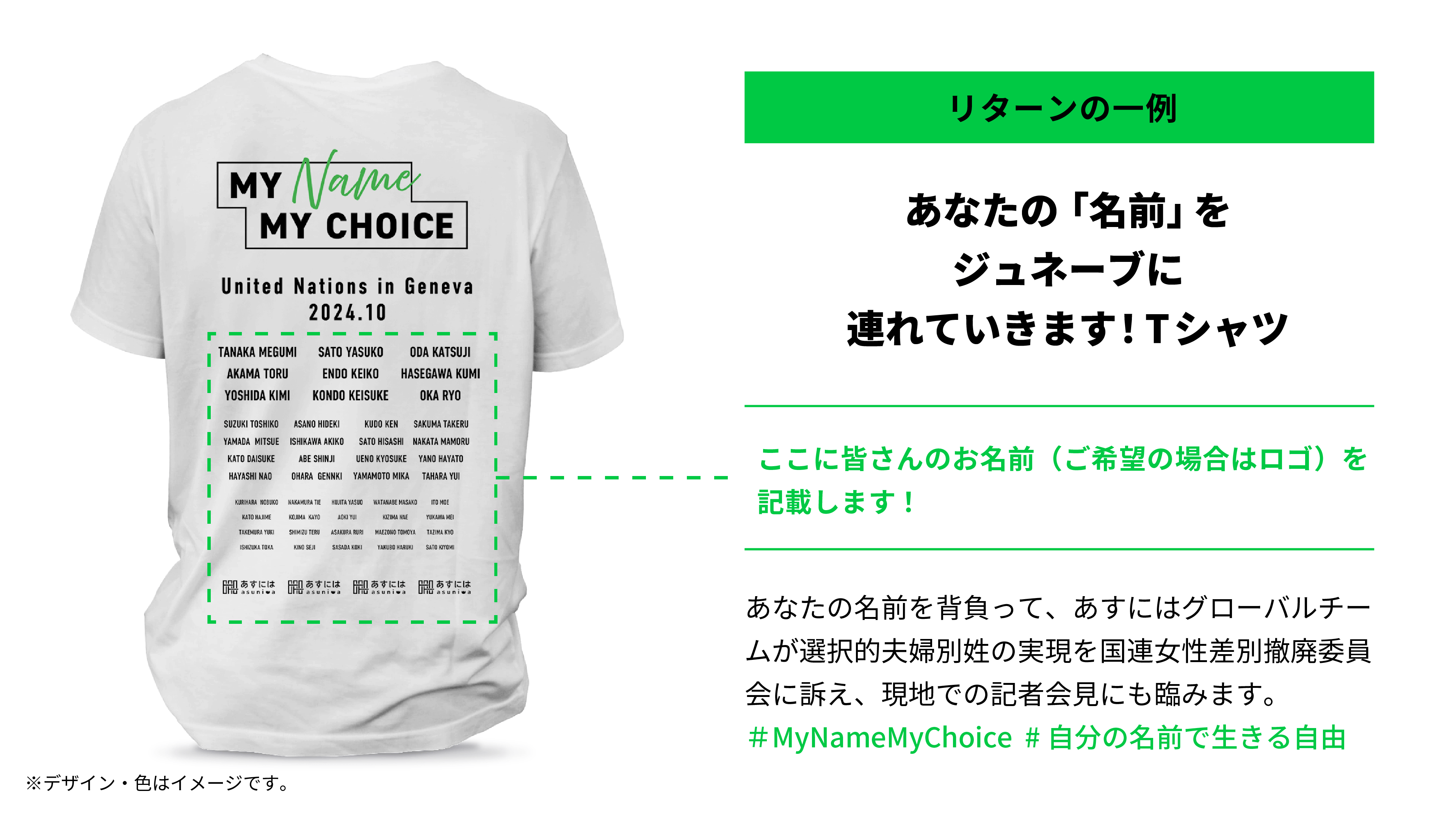 自分が自分だと思える名前で名乗り、呼ばれ、人との絆を紡ぎ、いのちを終えることができる社会を私たちは実現します。今回みなさまへご提案するリターンの中で、私たちがやりたいと考えているのが「あなたの名前をジュネーブに連れて行く」こと。あすにはグローバルチームのメンバーが、支援者の皆さんのお名前(ご希望の場合はロゴ)を背負って、ジュネーブでの活動・記者会見に臨みます。また制作したTシャツをお手元に届けるリターンもご用意しています。