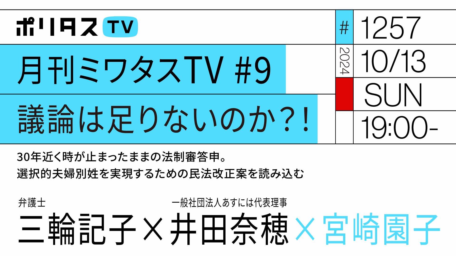 ジャーナリストの宮崎園子さん×弁護士の三輪記子さんの「月刊ミワタスTV #9 議論は足りないのか?!|30年近く時が止まったままの法制審答申。選択的夫婦別姓を実現するための民法改正案を読み込む」という回に、ジュネーブから参加させていただきます!ぜひご覧下さい。