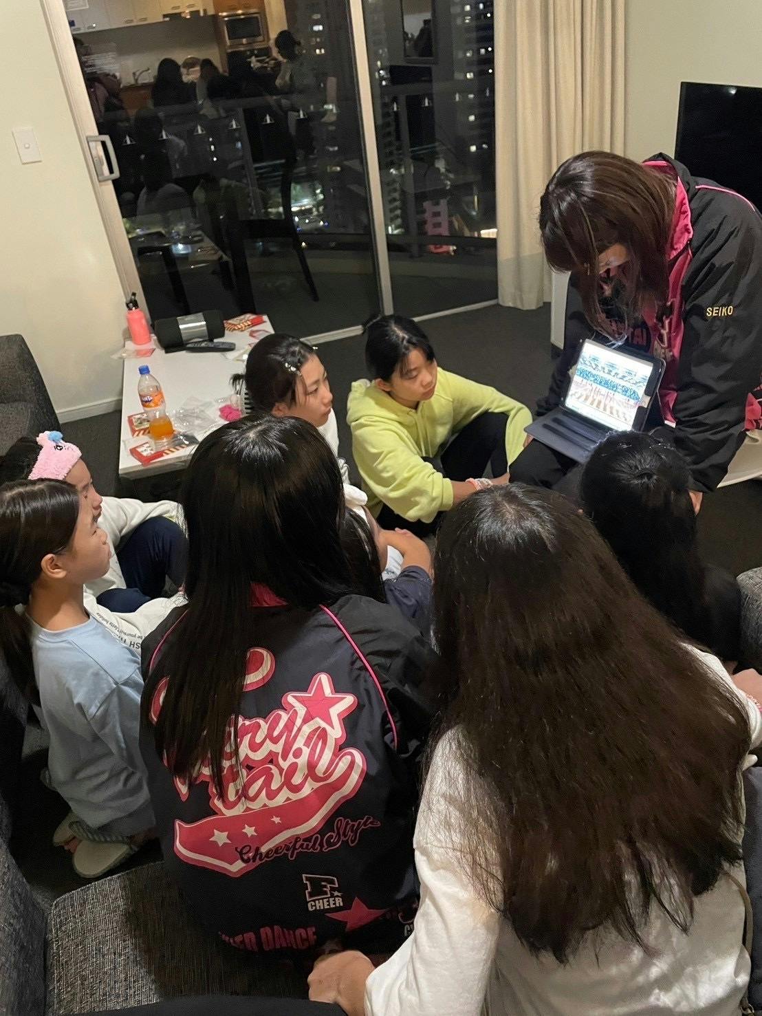 練習後、ホテルに帰宅し、夕飯を食べてからメンバー集合して練習動画のチェックをしてメンバーと先生で話しました。