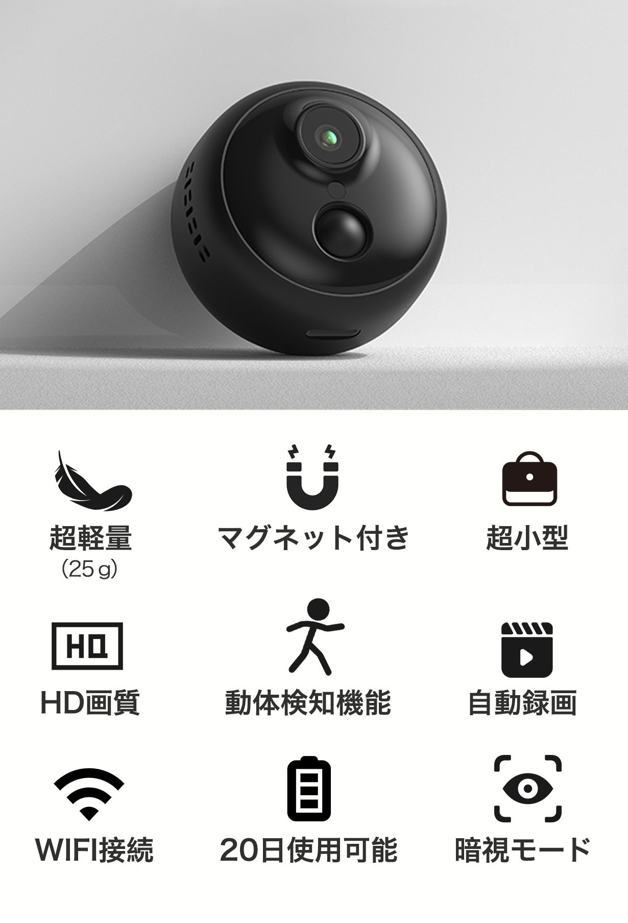 Q2:本カメラのバッテリー寿命はどのくらいですか?A2:本カメラは、一回のフル充電で最大20日連続使用可能です。使用状況によって異なる場合があります。