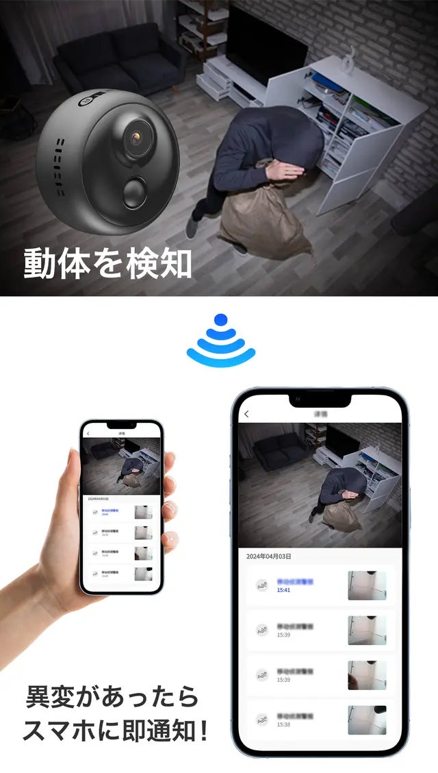 本カメラには動体検知機能が搭載されており、人や動物の動きを感知すると自動的に録画を開始し、スマホに通知を送ります。録画された動画はすぐに再生できます(動画はメモリカード内に保存する)。万が一異常が発生したとしても、いつでもどこでもリアルタイムで確認できます。