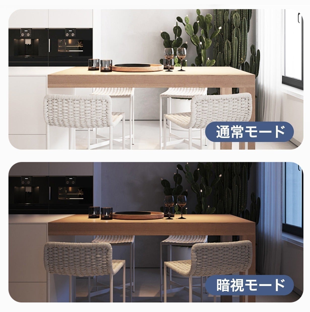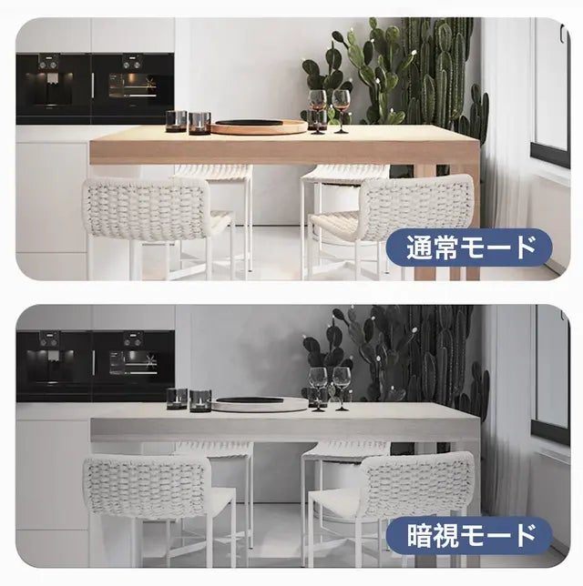 940nm赤外線による暗視モード搭載し、夜でも細かい部分をはっきりと白黒で録画できます(赤外線自身が光らない)。カメラは暗い環境の中で約5メートルの暗視が可能です。完全に暗い環境の中でも、細部をはっきりと捉えることができます。また、高精度の光センサーが周囲の明るさを認識し、状況に応じて通常モードと夜モードが自動で切り替わります。