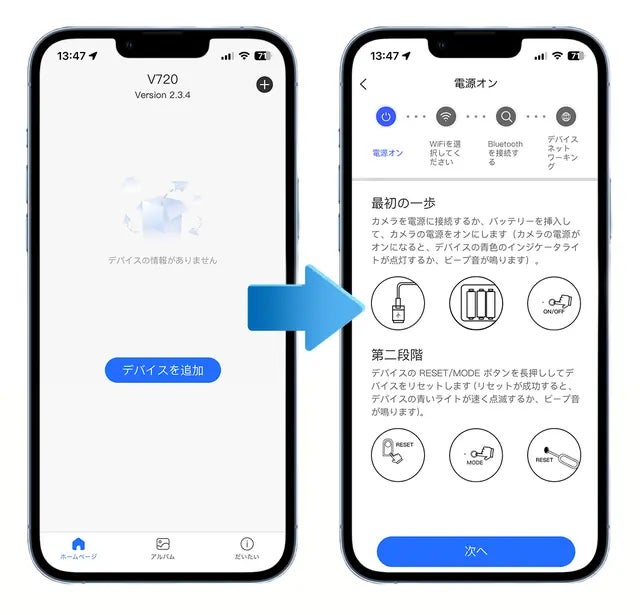 アプリ内でデバイスを追加のボタンを押して、WIFIやbluetooth経由でカメラとアプリを繋ぐことができます。