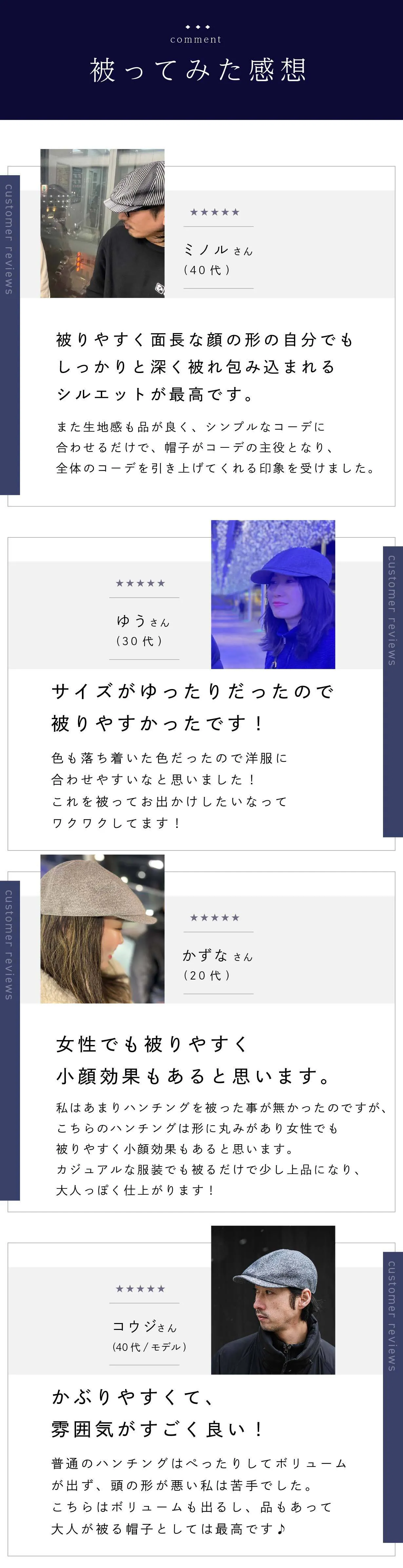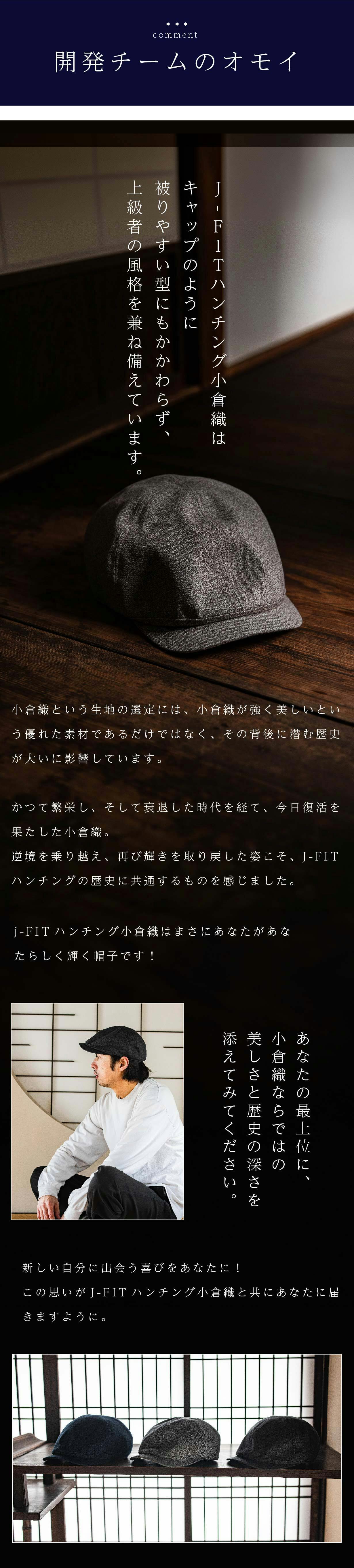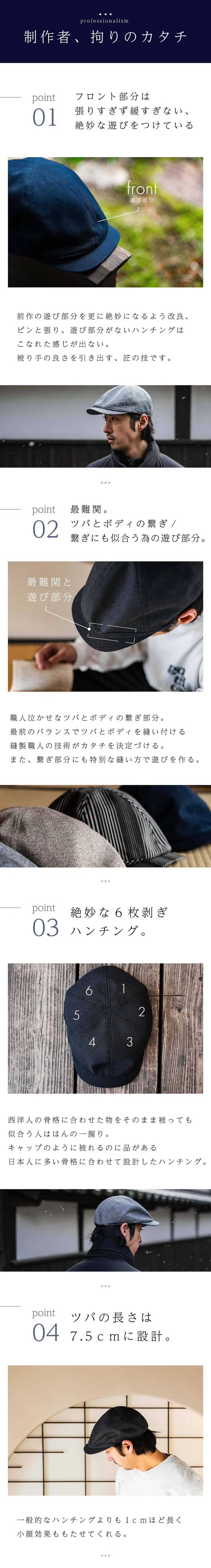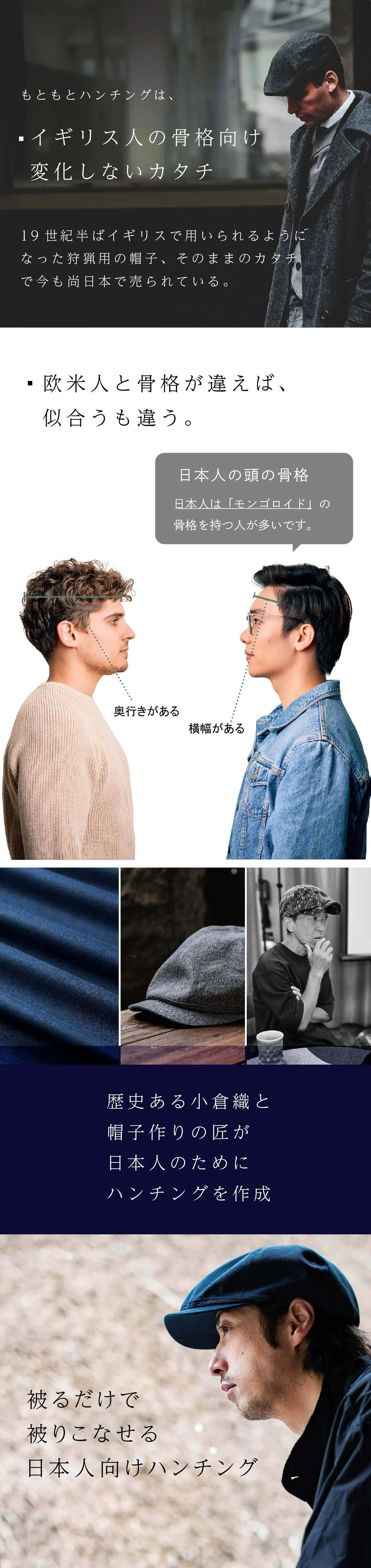 ハンチングは正直今でも私自身あまり被ることがありません。似合うカタチが本当に世の中に少ないからです。ただ1つ被っていたのが、今回のハンチングの初代モデルになります。発売がされなくなってからは、またハンチング離れが進んでしまいましたが今回を期に皆様と一緒にハンチングを被るという楽しみを味わえたらと考えております。本当に【こなれ感】がでる凄くいいハンチングですので皆様にも楽しんでもらえる自信があります!