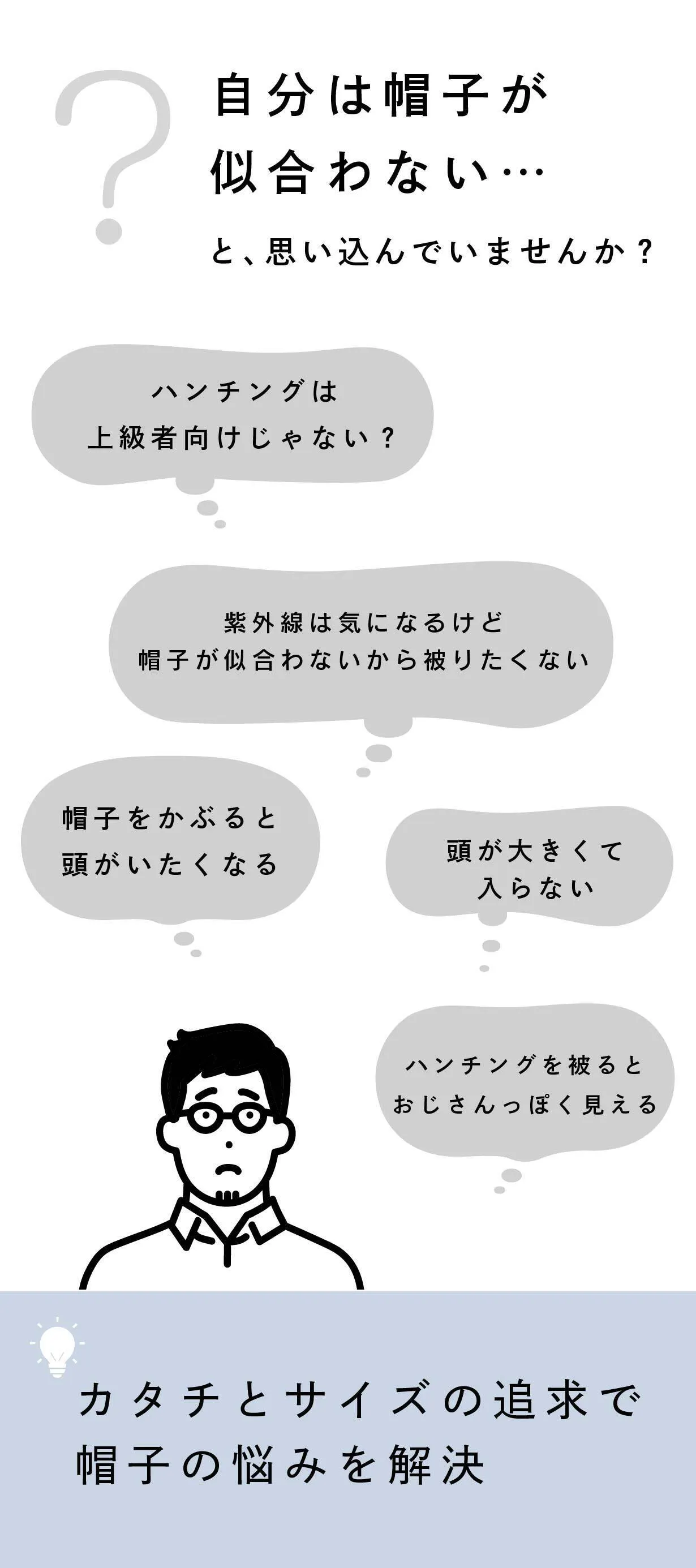 私は大学生(弊社にアルバイトで入社時)まで、帽子が似合わないと思い込んでいました。ですが、頭の大きな私(現在41歳)も今では帽子はライフスタイルの一部になっています。