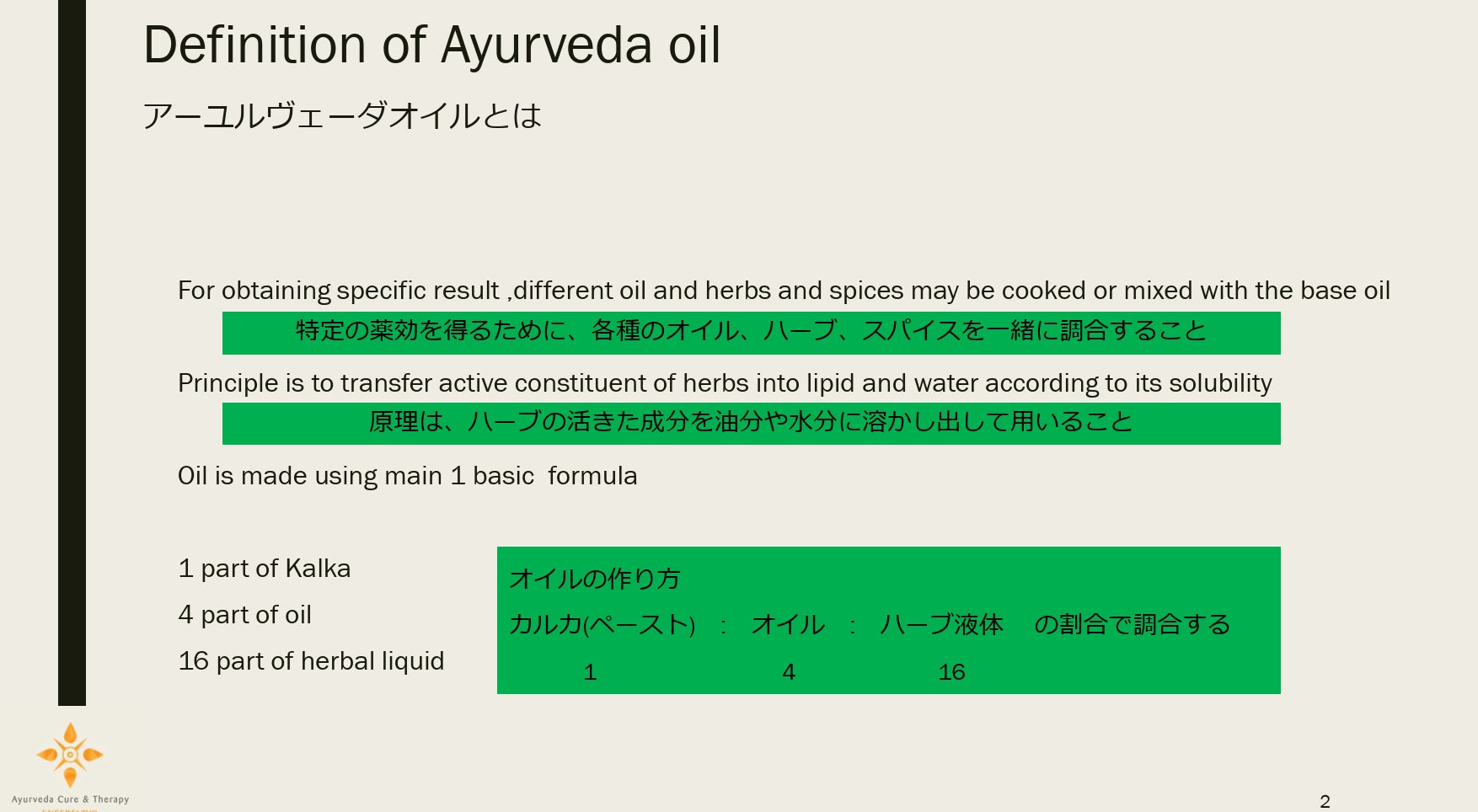 日本の薬局で薬の使い方を確認するのと同じように、アーユルヴェーダのオイルやスパイスはその人の体質に合わせた使い方が必要です。その知識やアドバイスを提供するのが【アーユルヴェーダの薬局】です。商品を提供するだけではなく、アーユルヴェーダを正しく実践するための窓口になりたいと思っています。
