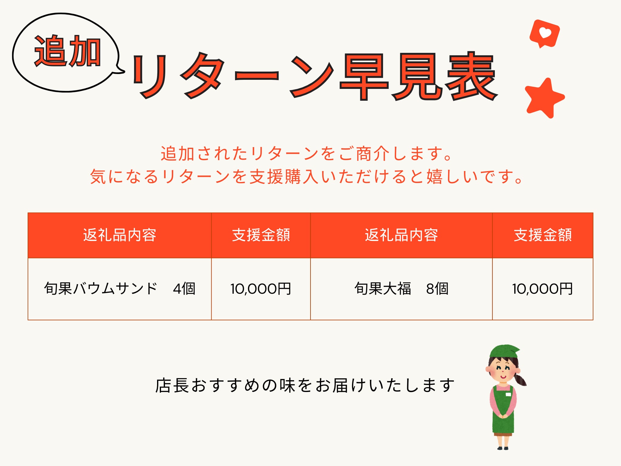 新たなお客様の為に、新しいメニューや新しいパッケージ、店内にカフェスペースも作りたいな…との想いで、このクラウドファンディングを立ち上げました。