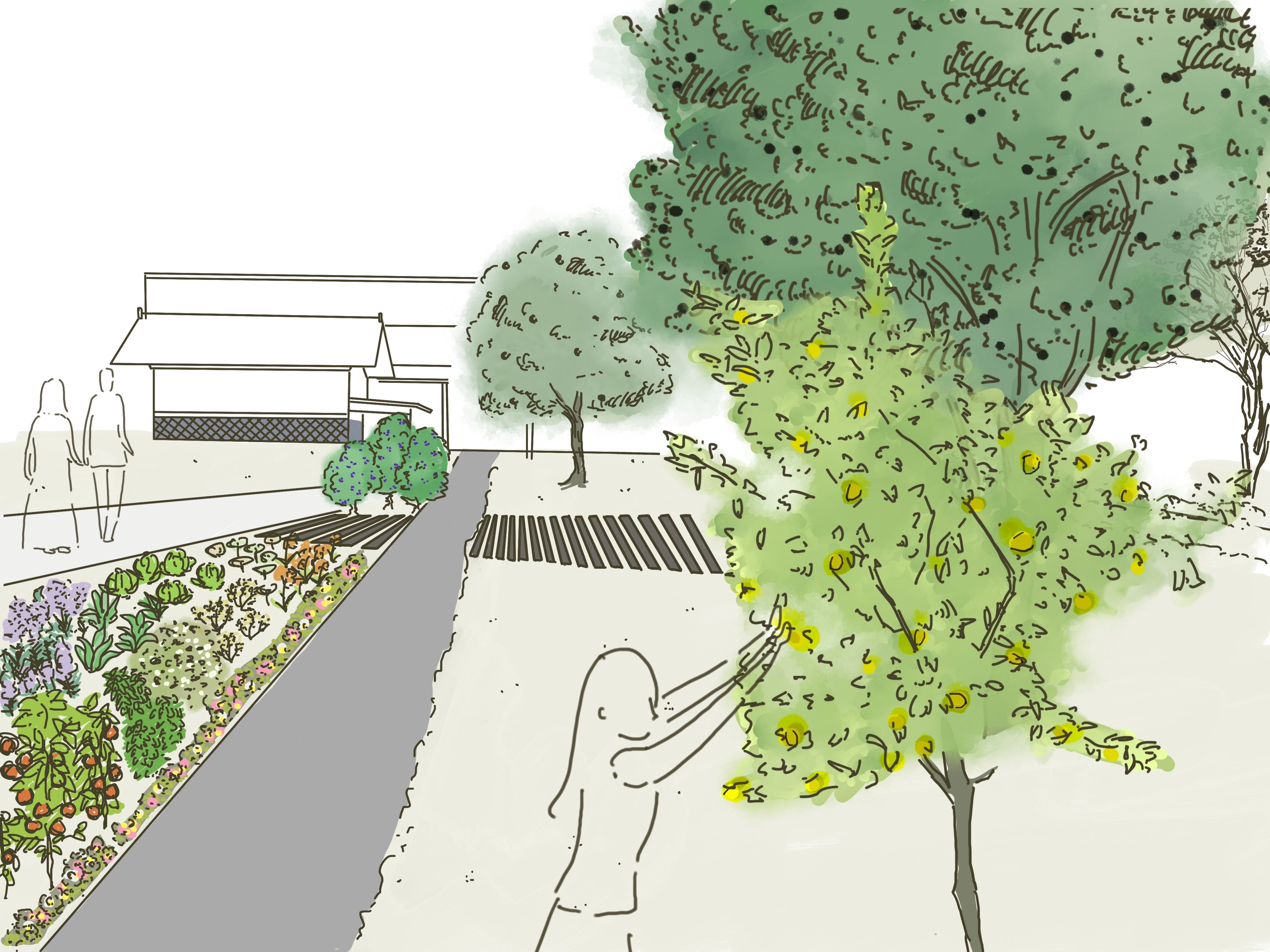 「訪れた方々とともに育て、みんなで分け合う」をテーマに、エディブルランドスケープ(=食べられる景観)を取り入れていきます。観賞するだけではなく、「見る」「収穫する」「食べる」といった文化的行動をともに行うことで、コミュニティが形成・充実されるのではないかと考えます。また、食べることを通じて環境に触れることで、富岡町のテロワールを実感していただきたいという願いもあります。試行錯誤しながらになりますが、皆さまに楽しんでいただけるような空間を目指していきます。