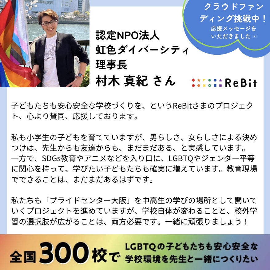 村木真紀さん(認定NPO法人虹色ダイバーシティ理事長)から、応援メッセージをいただきました!