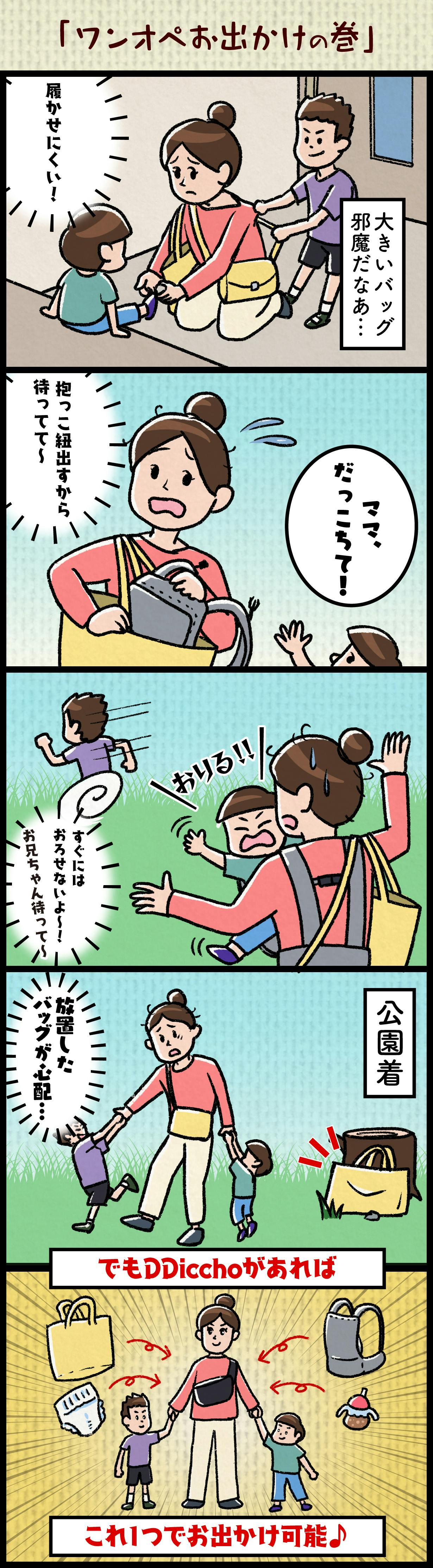 Hug育バッグ「DDiccho(ディーディーイッチョ)」は、(どこでもいっちょ)の意味が込められています。これは我が子の口癖「いっちょに」を叶えたいと誕生したブランド名です。