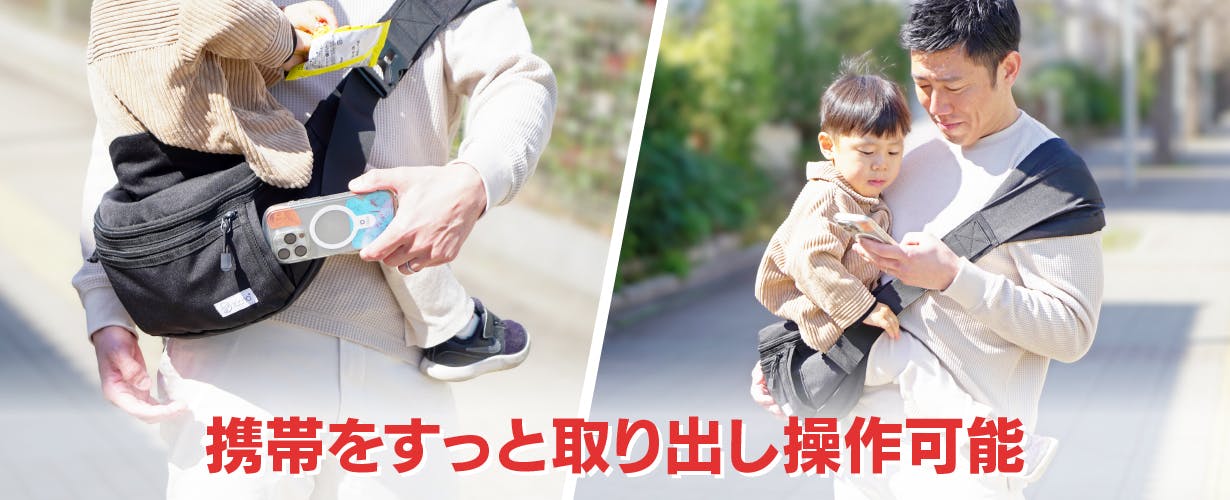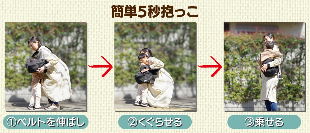 ベルトを伸ばし、子どもを抱っこした後、片手で簡単にベルトの調節を行うことが可能に。子どもを抱っこしやすい位置まで簡単に持ち上げることができます。