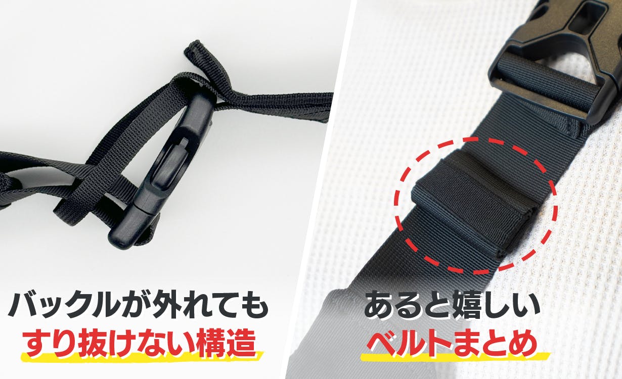 セーフティーバンドがあることで、ベルトがすり抜けにくい構造になっています。