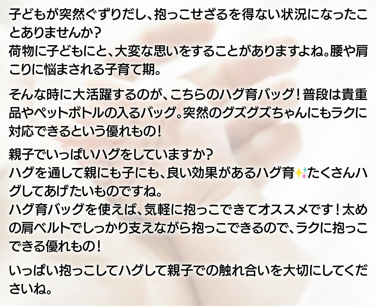 【Hug育バッグ 「DDiccho」】は、抱っこされたい。抱っこしたい。が叶うように、Hugが無理なく自然に行える環境を作りだしていくことをお手伝いします。
