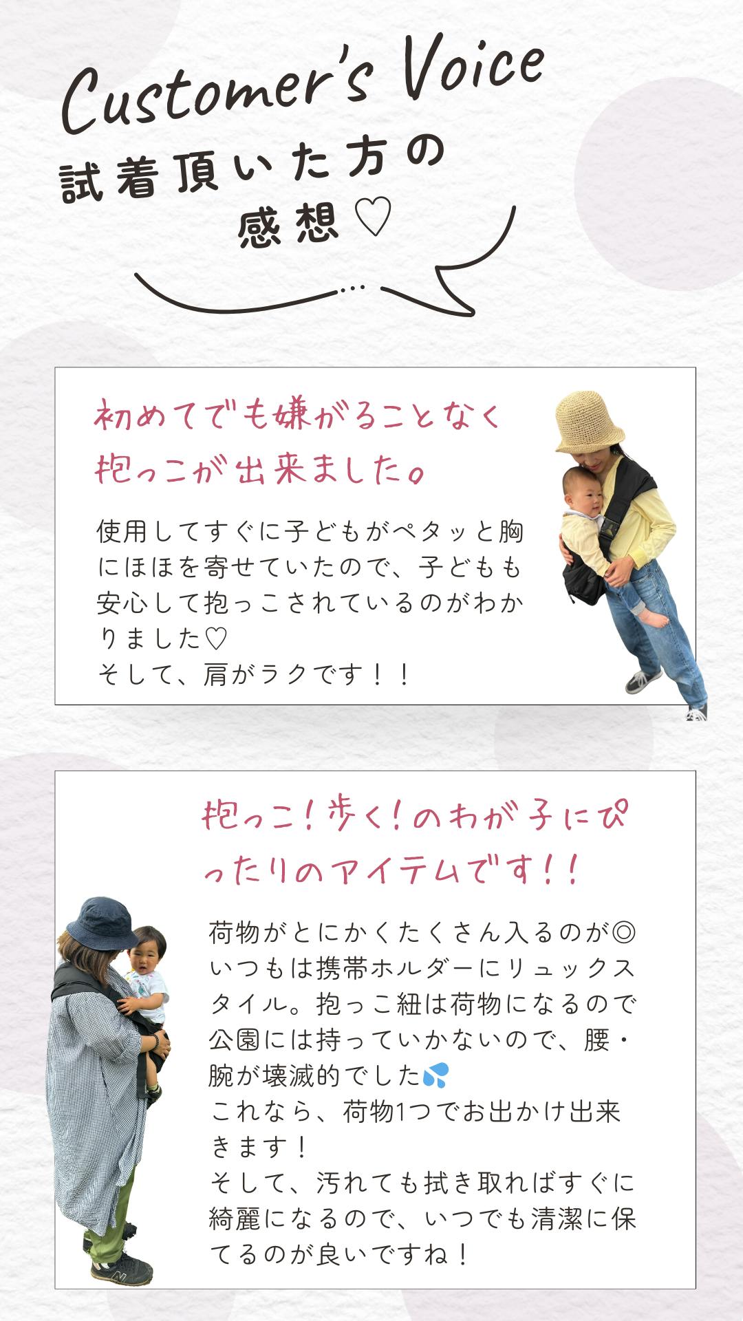 また、抱っこ以外の子育ての場面でもとても使いやすいように作り上げました。抱っこを卒業した後も末永くご使用いただけます。