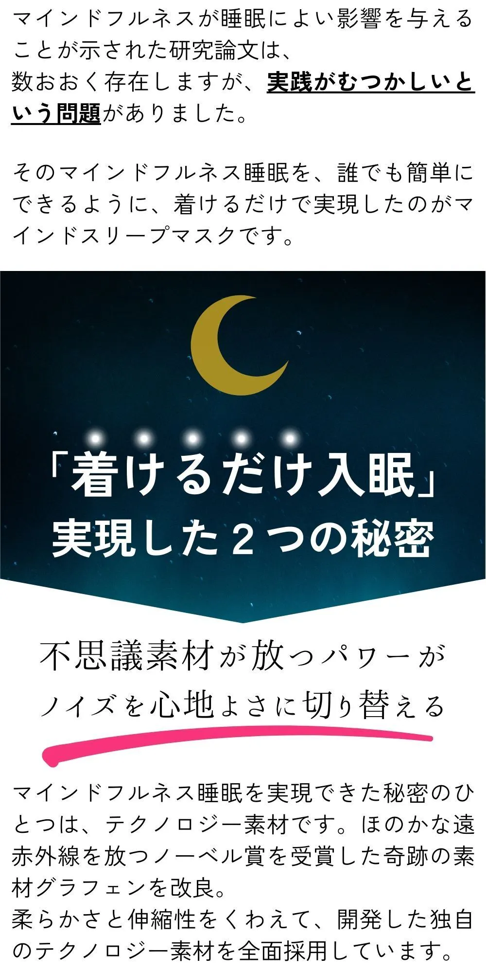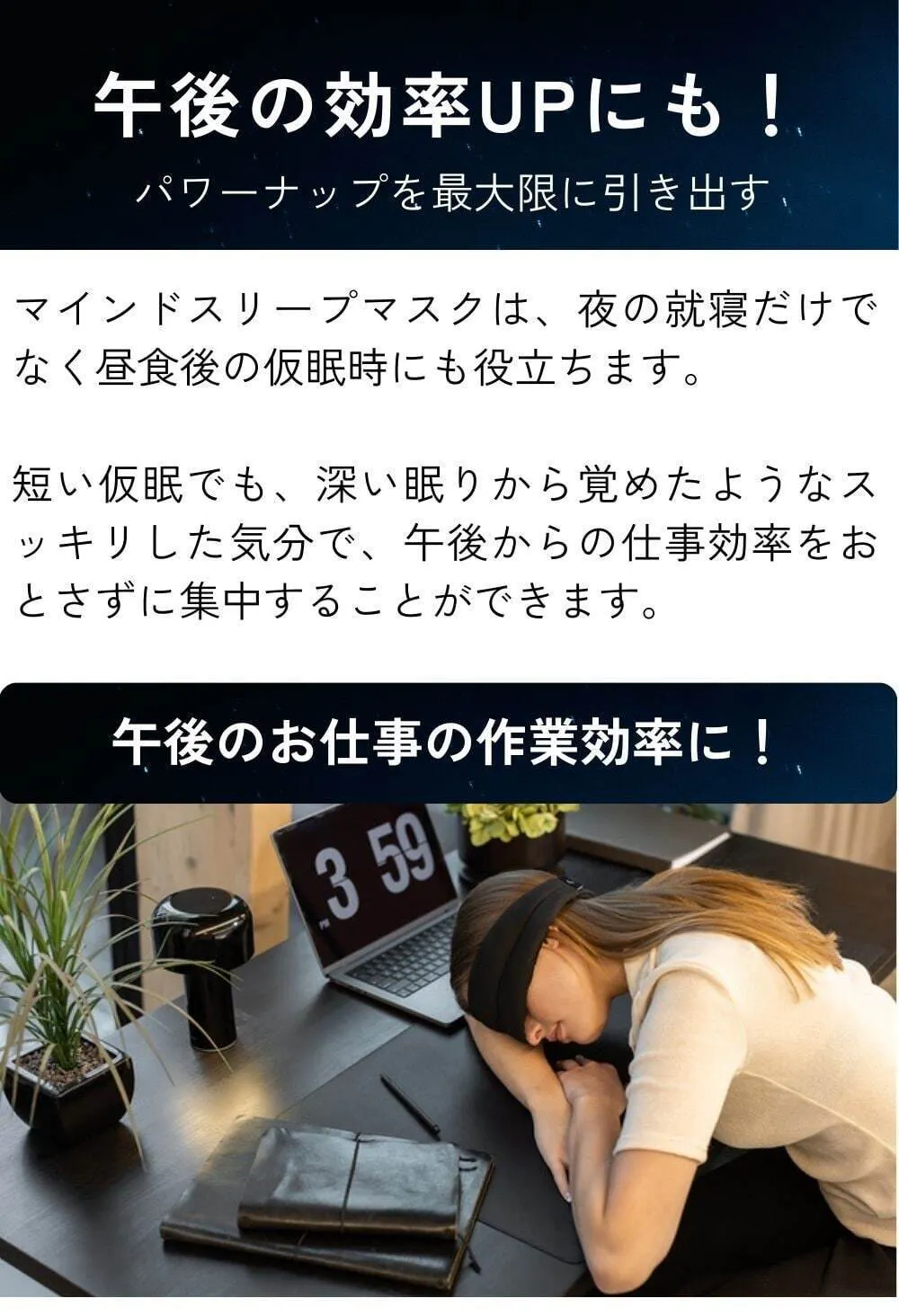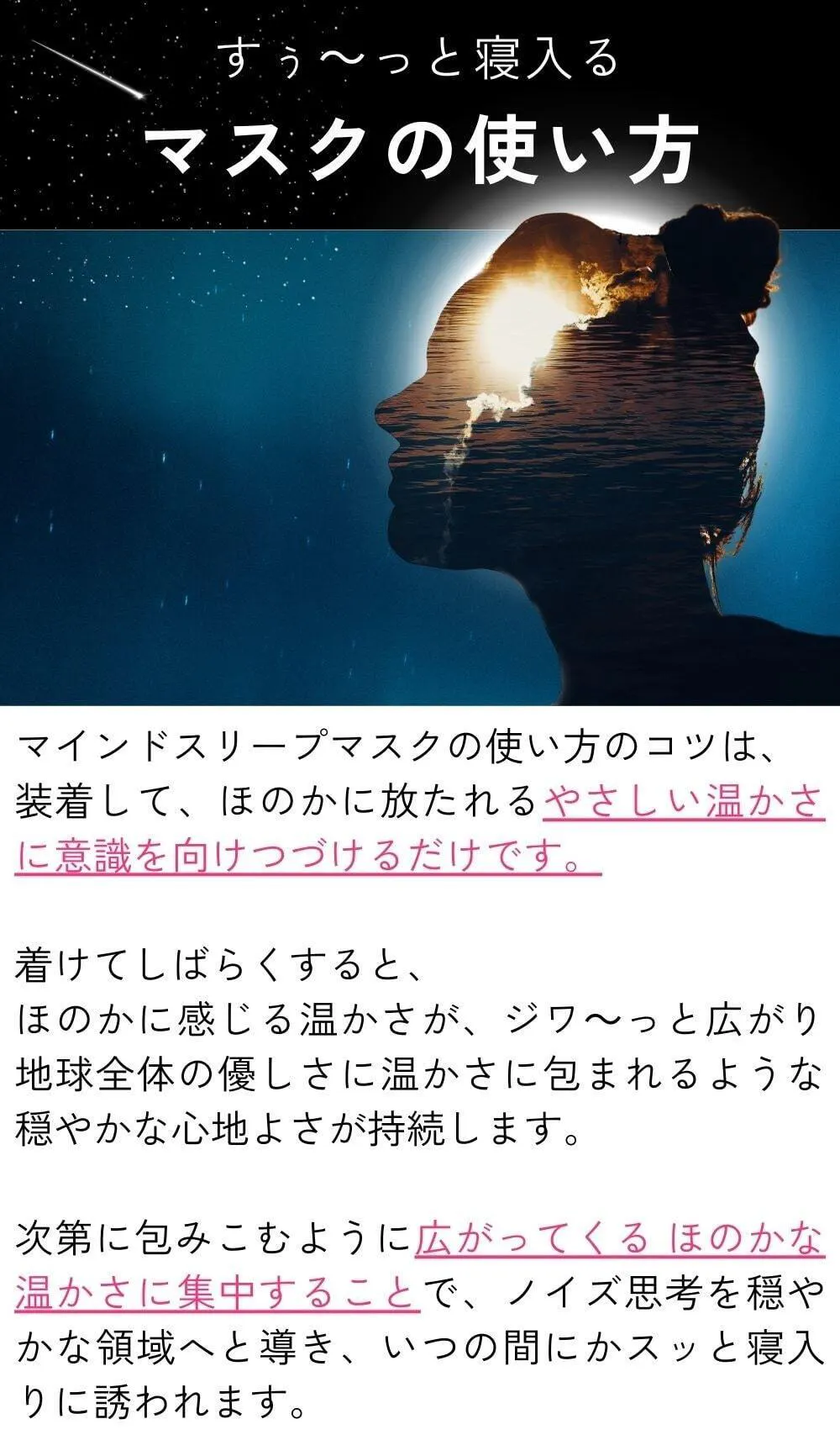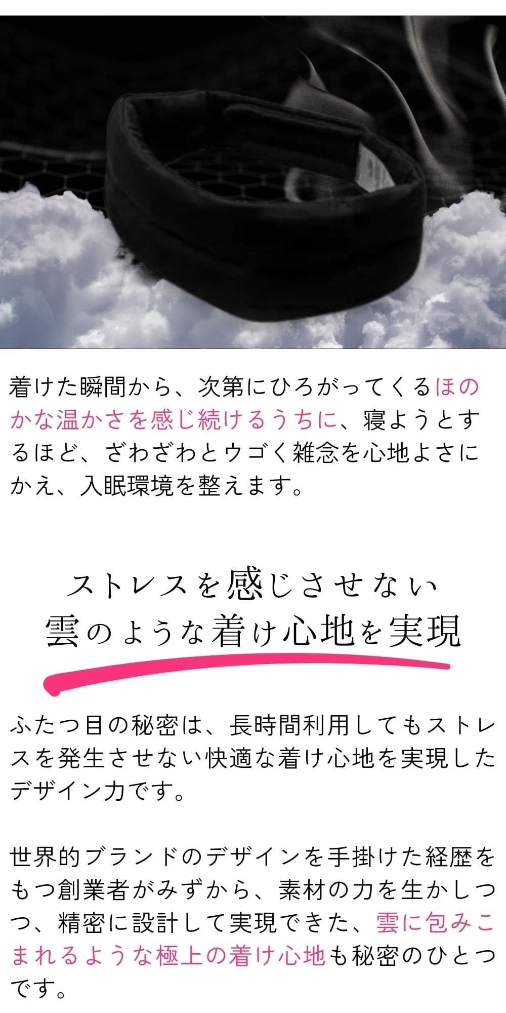 世界的なデザイン技術をもとに生み出された独自の特性を持つマインドスリープマスクが、現代の睡眠に関する問題に悩む多くの方々にとって有益なサポートとなることを期待しております。