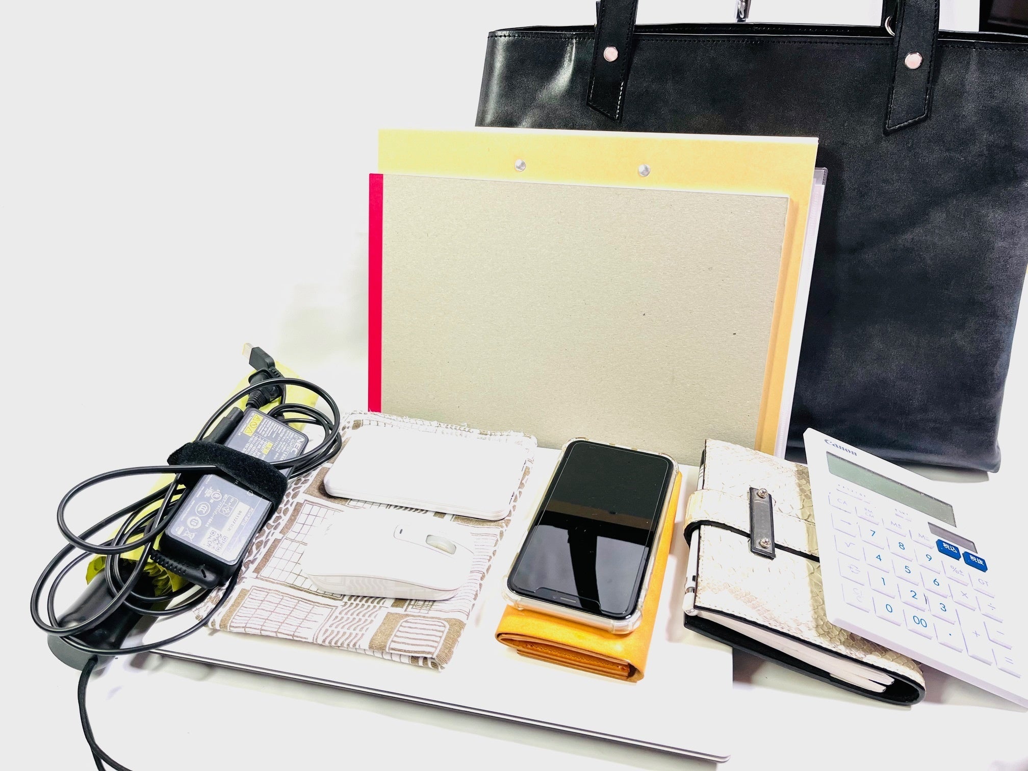 14型ノートパソコン・A4ファイル・A4ファイルバインダー・折りたたみ傘・500mlペットボトル・長財布・スマホ・バッテリー充電器・充電コード・電卓・システム手帳・カードケース・パスポート・お財布コインケース・単行本・メモ帳・ペン・ハンドタオル(ハンカチ)など・・・。