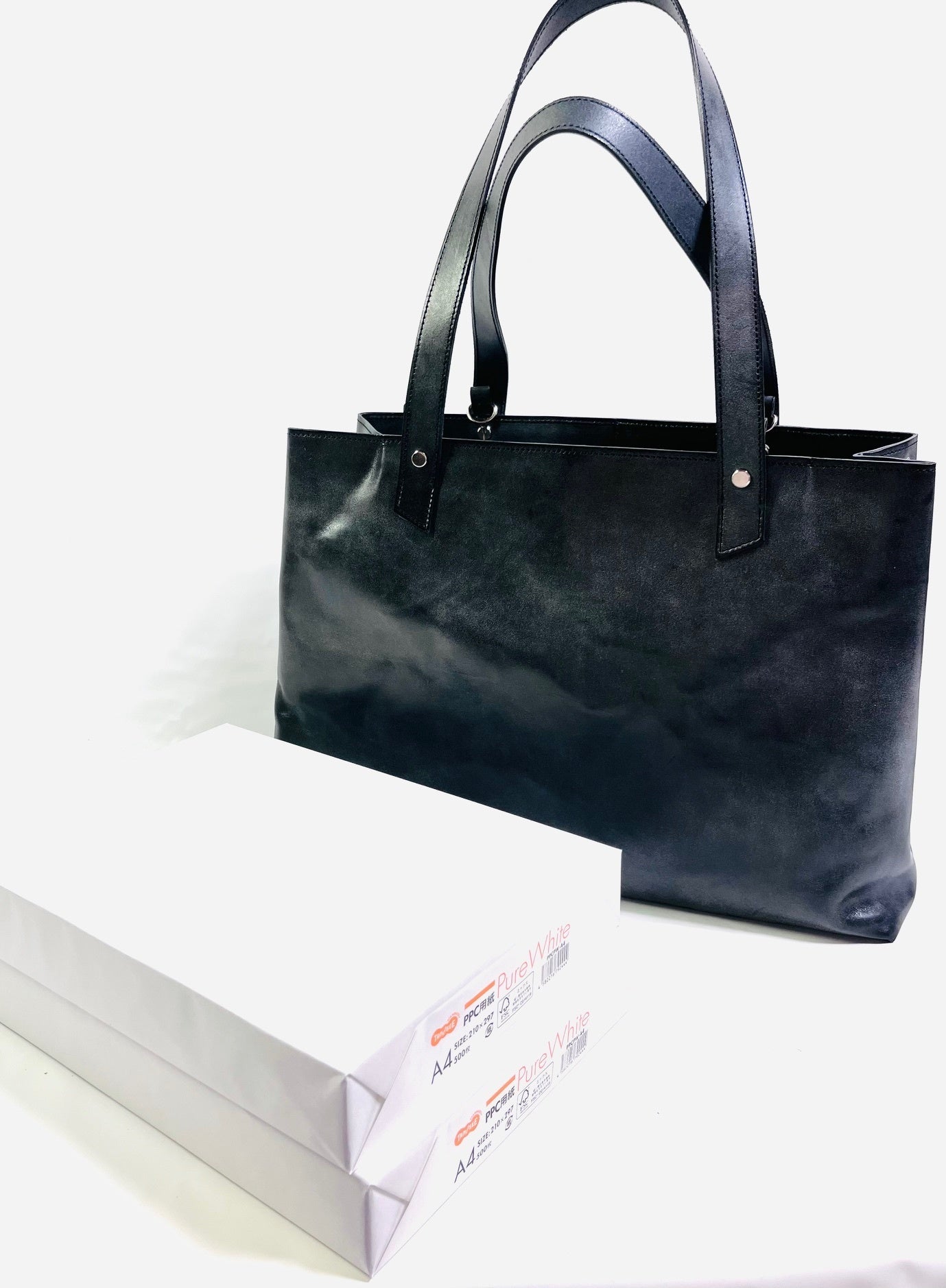 収納力にも拘った今回の「大きめトートバッグ」なので、普段持ち歩く物はほとんど収納出来てしまいます。収納量の目安としてA4サイズのコピー用紙が1,000枚楽々収まってしまう収納力になります。