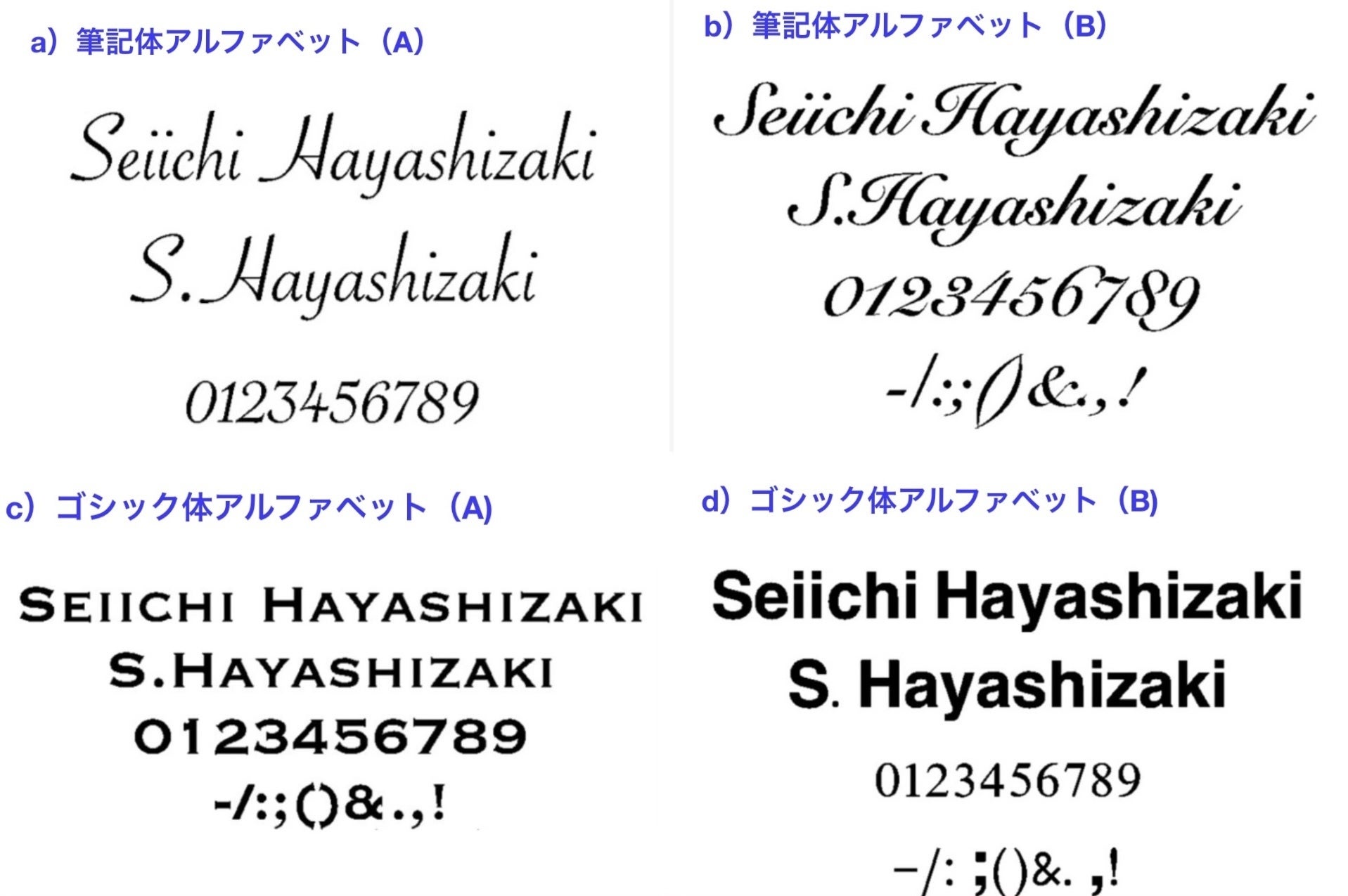 ■レーザー彫刻名入れは、下記4種類の書体(フォント)になります。