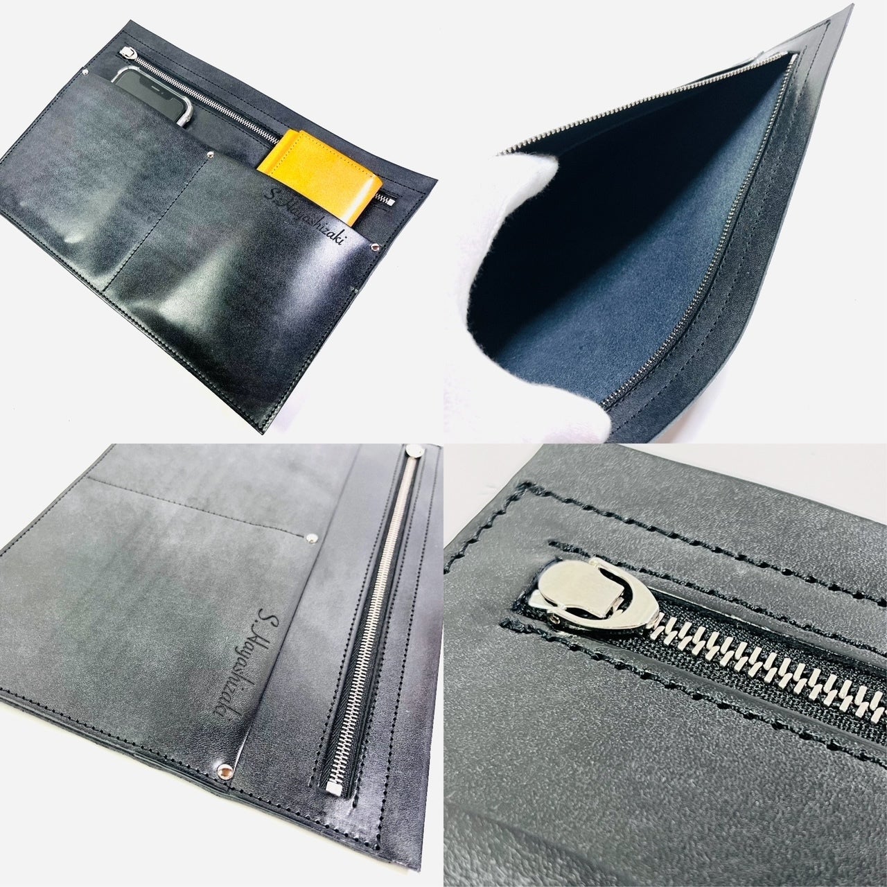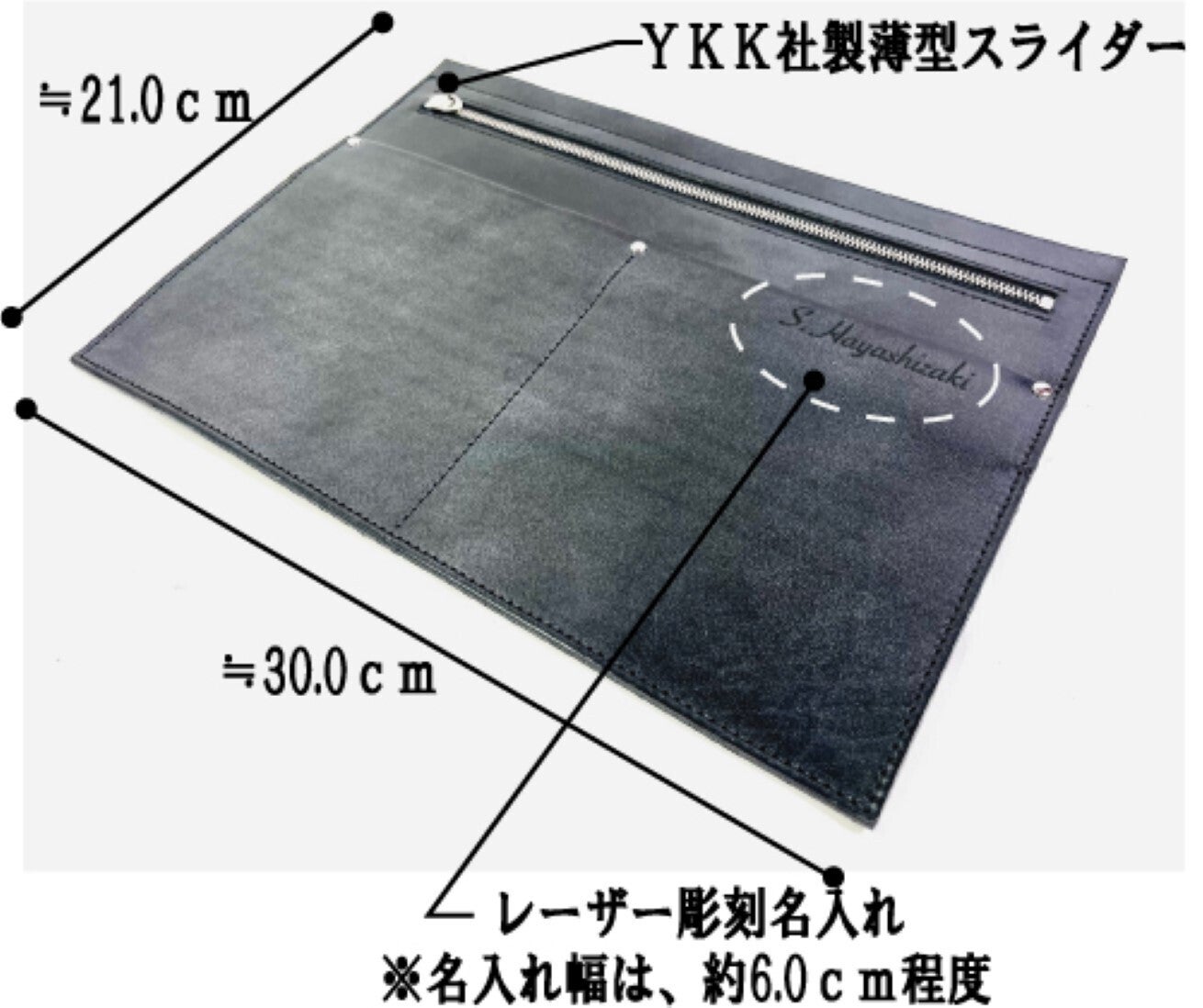 ・YKKエクセラファスナーポケット1箇所・携帯電話やお財布などを差し込めるポケット2箇所・ファスナーポケット開口は、約25.0cm 深さ約17.0cm・約20文字までのレーザー彫刻名入れ込(レーザー彫刻なので文字は焼き印状態の黒に近い色になります。)