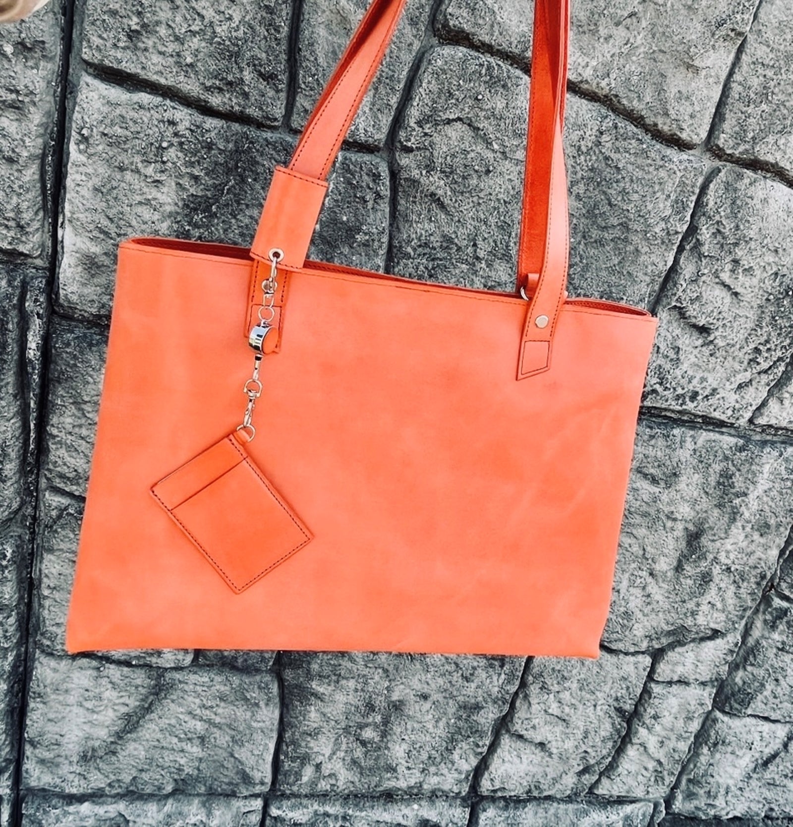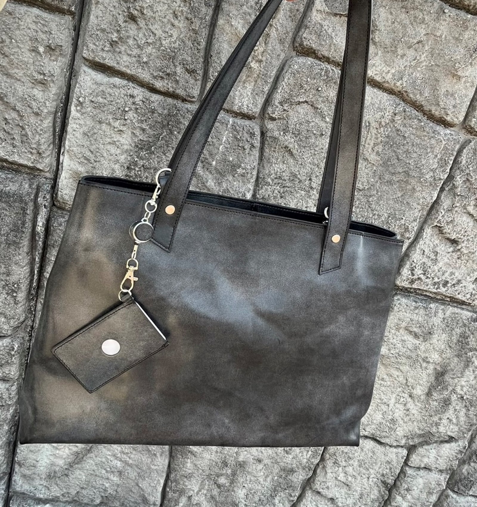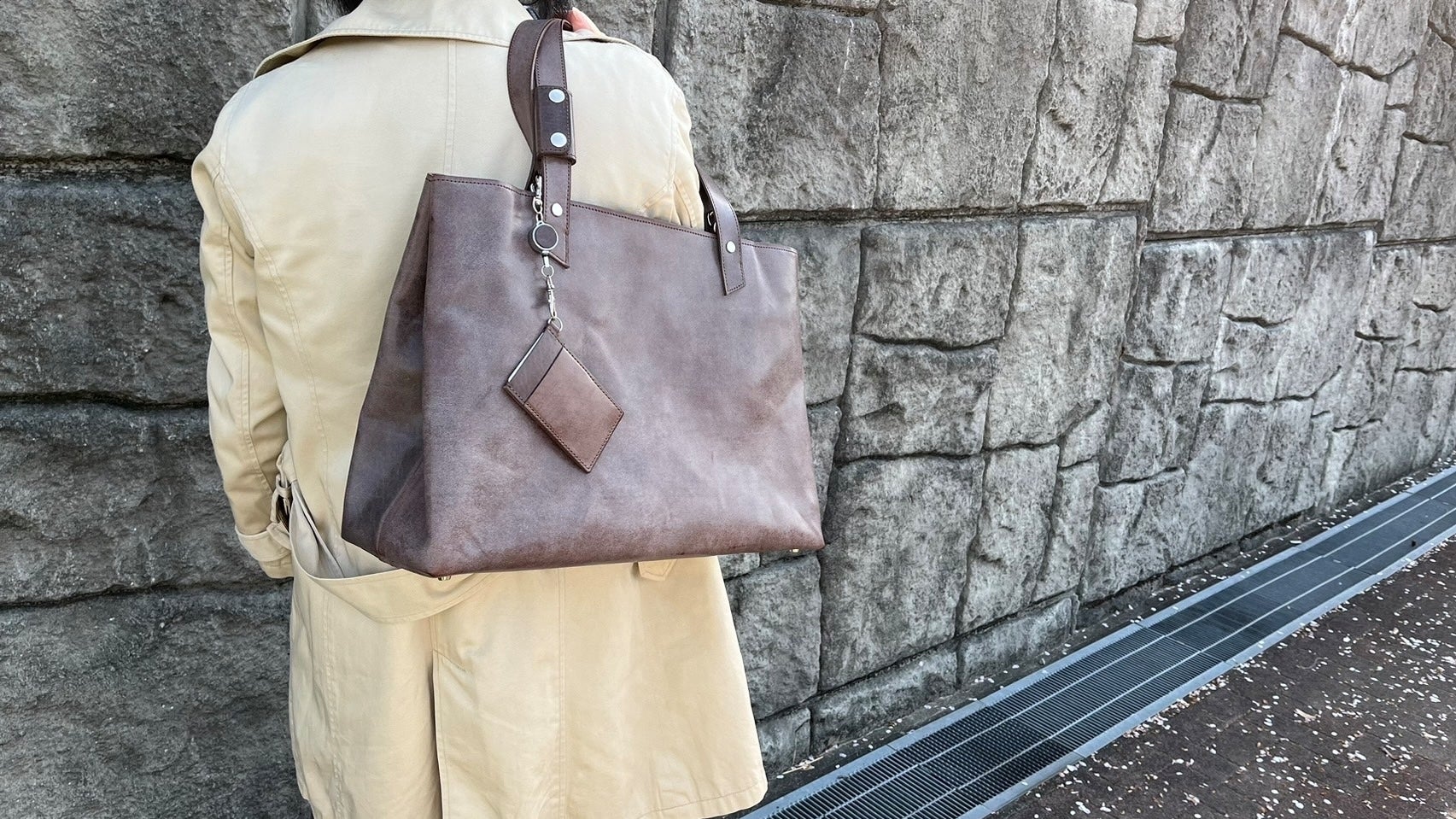 表裏にカードスリットが合計2箇所付いております。トートバッグ本体持ち手裏側のDカンに提げたり、オプションのハンドルカバーのハトメ穴に取り付けるられます。