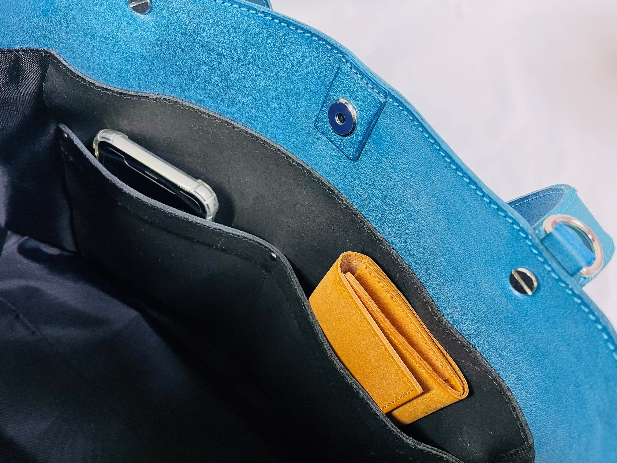 ■標準仕様の床革ポケットは、スマホや長財布など収納可能な仕様になっています。