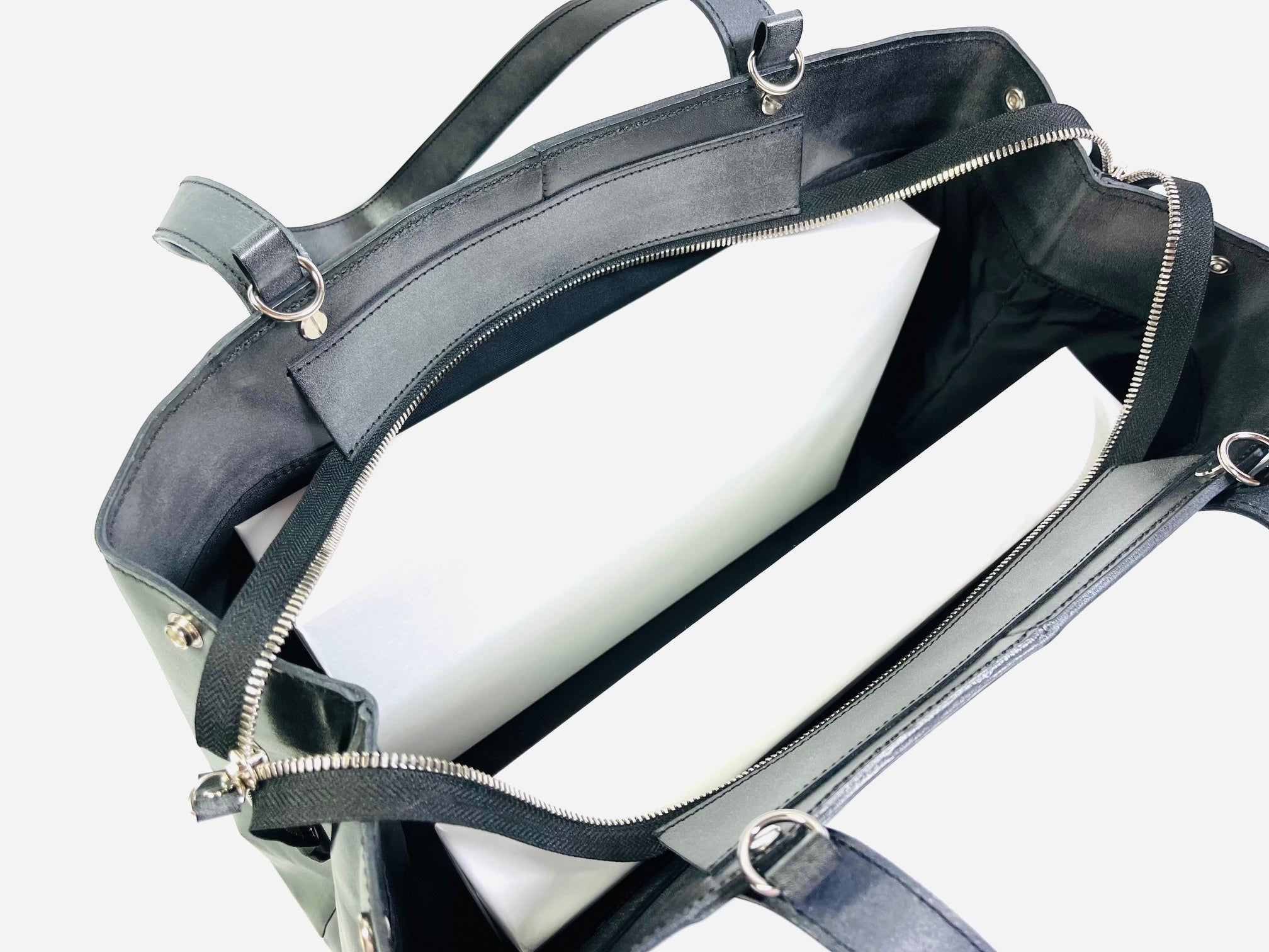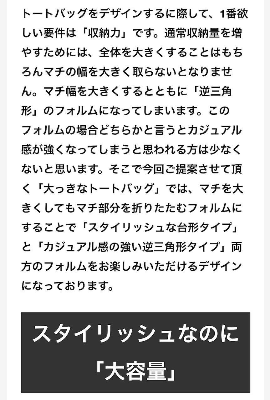 ビジネスシーンでは、A4サイズの書類(バインダーやファイル)を収納できるかどうかが【使いやすい・使いにくい】の基準だと思います。収納力を重視した逆三角形型では、スーツスタイルには違和感を感じてしまいます。どうしてもカジュアル感が強くなってしまうと言う皆様からのお声を頂いてデザインした「トートバッグ」