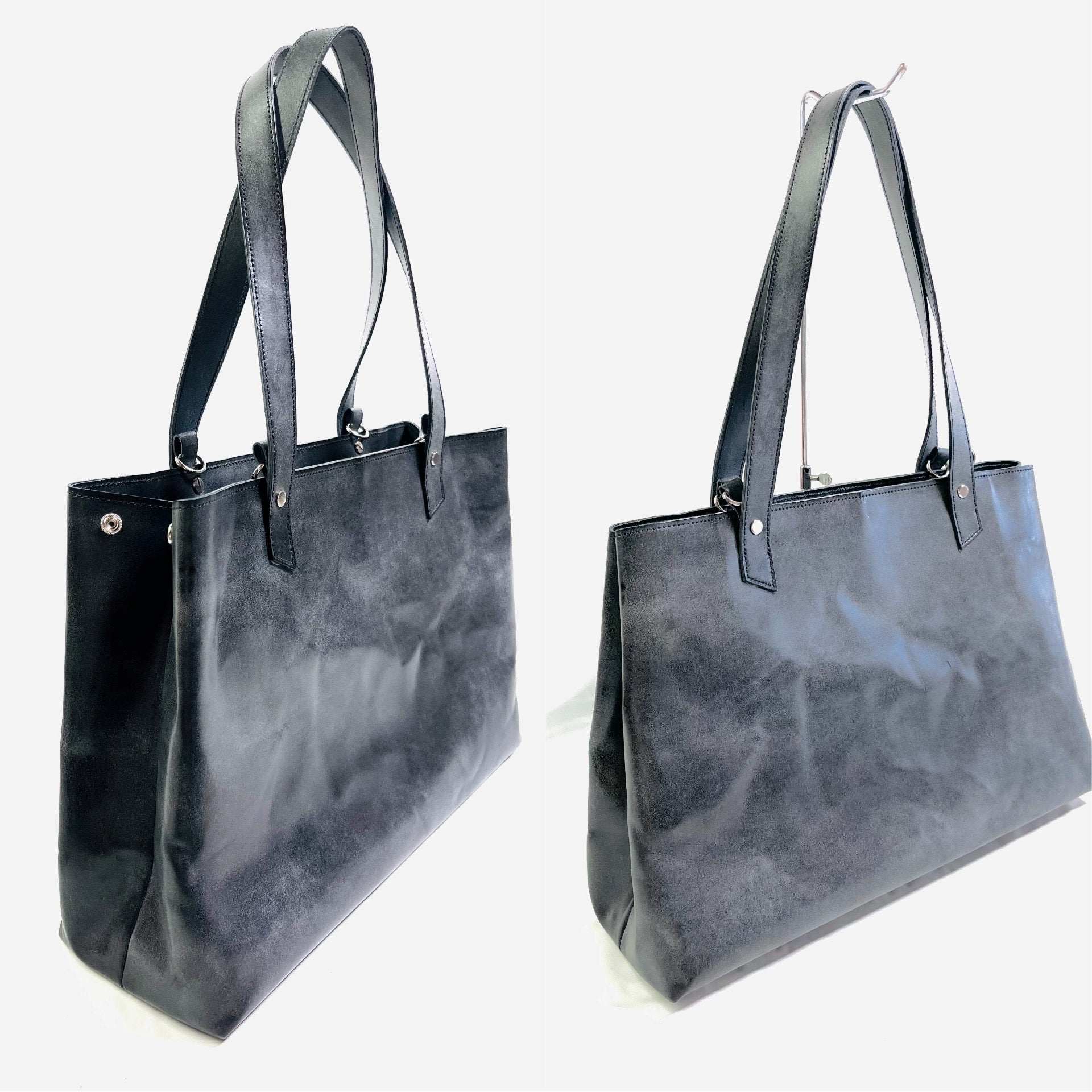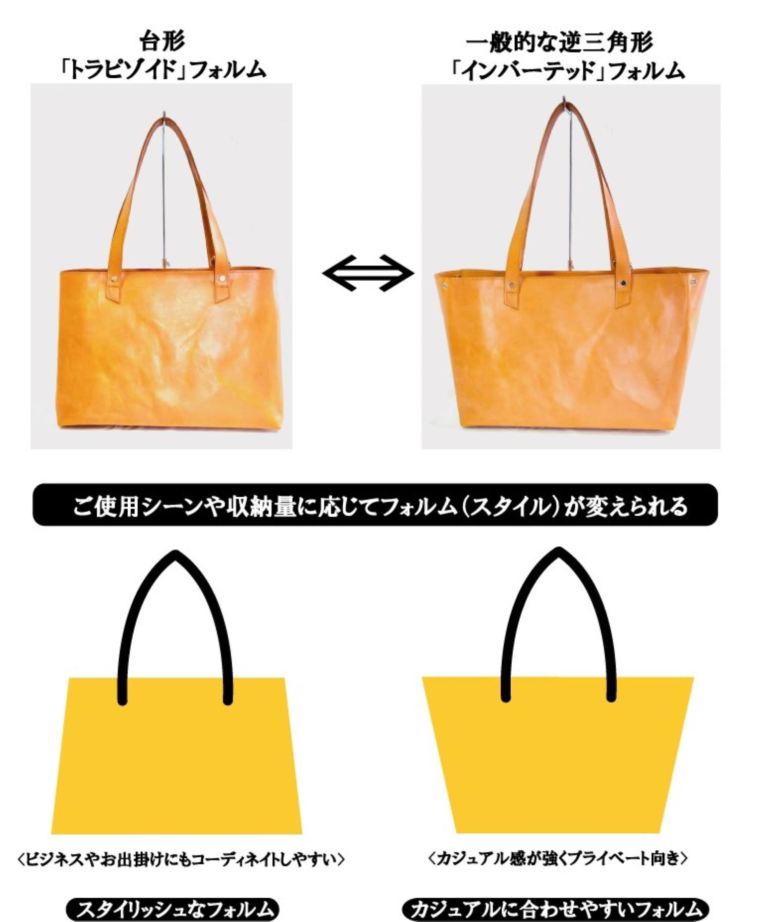 カジュアルな「逆三角形」(inverted triangle)デザインからスタイリッシュな「台形」(trapezoid)フォルムに用途に合わせ変化出来るデザイン。「ビジネスシーン」「プライベートシーン」どちらとも収納量やご使用シーンに合わせフォルムが変えられる性別年齢問わない収納力にも特化したジェンダーレスな「大っきなトートバッグ」になります。