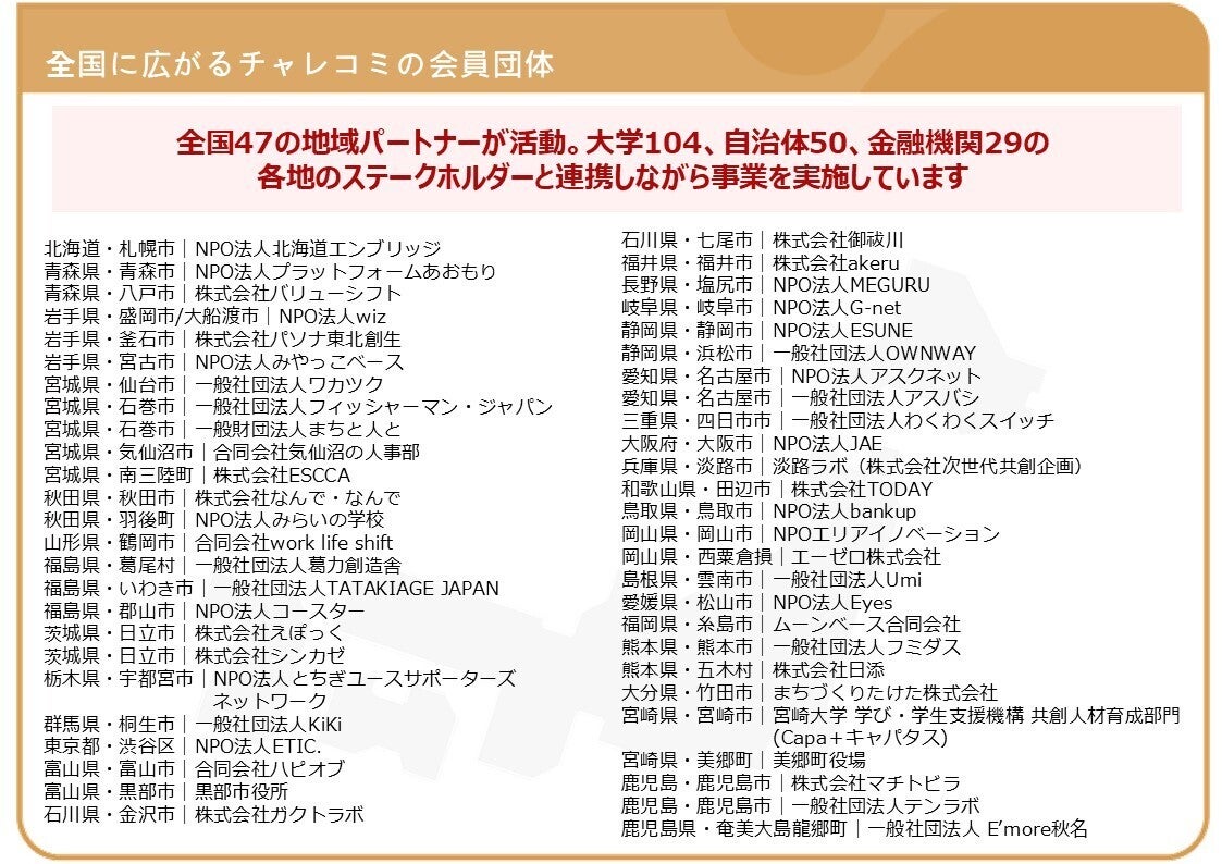 チャレコミをはじめ全国のコーディネーターたちと連携したプログラムづくりなどにも取り組んでいます。